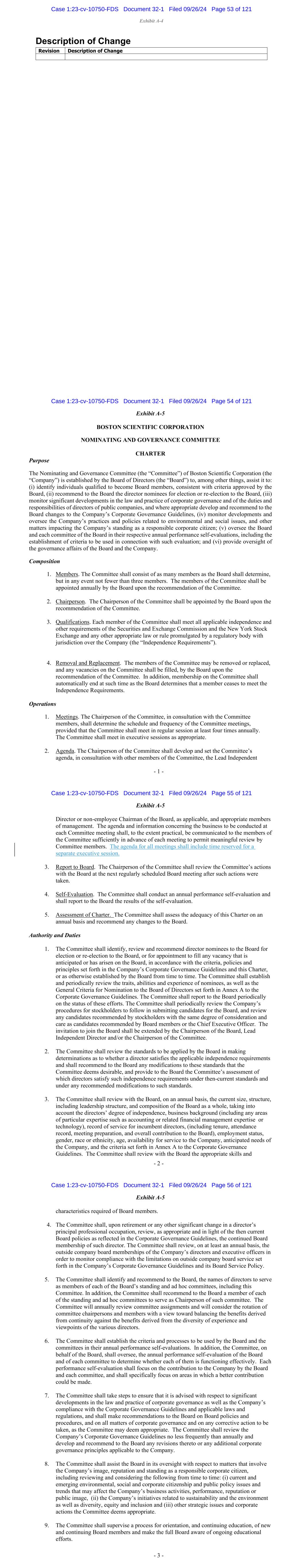 Description of Change Exhibit A-4 Revision Description of Change xhibit -4 escripti n f ange visi n escripti n f ange Case 1:23-cv-10750-FDS Document 32-1 Filed 09/26/24 Page 53 of 121 Exhibit A-5 - 1 - BOSTON SCIENTIFIC CORPORATION NOMINATING AND GOVERNANCE COMMITTEE CHARTER Purpose The Nominating and Governance Committee (the “Committee”) of Boston Scientific Corporation (the “Company”) is established by the Board of Directors (the “Board”) to, among other things, assist it to: (i) identify individuals qualified to become Board members, consistent with criteria approved by the Board, (ii) recommend to the Board the director nominees for election or re-election to the Board, (iii) monitor significant developments in the law and practice of corporate governance and of the duties and responsibilities of directors of public companies, and where appropriate develop and recommend to the Board changes to the Company’s Corporate Governance Guidelines, (iv) monitor developments and oversee the Company’s practices and policies related to environmental and social issues, and other matters impacting the Company’s standing as a responsible corporate citizen; (v) oversee the Board and each committee of the Board in their respective annual performance self-evaluations, including the establishment of criteria to be used in connection with such evaluation; and (vi) provide oversight of the governance affairs of the Board and the Company. Composition 1. Members. The Committee shall consist of as many members as the Board shall determine, but in any event not fewer than three members. The members of the Committee shall be appointed annually by the Board upon the recommendation of the Committee. 2. Chairperson. The Chairperson of the Committee shall be appointed by the Board upon the recommendation of the Committee. 3. Qualifications. Each member of the Committee shall meet all applicable independence and other requirements of the Securities and Exchange Commission and the New York Stock Exchange and any other appropriate law or rule promulgated by a regulatory body with jurisdiction over the Company (the “Independence Requirements”). 4. Removal and Replacement. The members of the Committee may be removed or replaced, and any vacancies on the Committee shall be filled, by the Board upon the recommendation of the Committee. In addition, membership on the Committee shall automatically end at such time as the Board determines that a member ceases to meet the Independence Requirements. Operations 1. Meetings. The Chairperson of the Committee, in consultation with the Committee members, shall determine the schedule and frequency of the Committee meetings, provided that the Committee shall meet in regular session at least four times annually. The Committee shall meet in executive sessions as appropriate. 2. Agenda. The Chairperson of the Committee shall develop and set the Committee’s agenda, in consultation with other members of the Committee, the Lead Independent Case 1:23-cv-10750-FDS Document 32-1 Filed 09/26/24 Page 54 of 121 Exhibit A-5 - 2 - Director or non-employee Chairman of the Board, as applicable, and appropriate members of management. The agenda and information concerning the business to be conducted at each Committee meeting shall, to the extent practical, be communicated to the members of the Committee sufficiently in advance of each meeting to permit meaningful review by Committee members. The agenda for all meetings shall include time reserved for a separate executive session. 3. Report to Board. The Chairperson of the Committee shall review the Committee’s actions with the Board at the next regularly scheduled Board meeting after such actions were taken. 4. Self-Evaluation. The Committee shall conduct an annual performance self-evaluation and shall report to the Board the results of the self-evaluation. 5. Assessment of Charter. The Committee shall assess the adequacy of this Charter on an annual basis and recommend any changes to the Board. Authority and Duties 1. The Committee shall identify, review and recommend director nominees to the Board for election or re-election to the Board, or for appointment to fill any vacancy that is anticipated or has arisen on the Board, in accordance with the criteria, policies and principles set forth in the Company’s Corporate Governance Guidelines and this Charter, or as otherwise established by the Board from time to time. The Committee shall establish and periodically review the traits, abilities and experience of nominees, as well as the General Criteria for Nomination to the Board of Directors set forth in Annex A to the Corporate Governance Guidelines. The Committee shall report to the Board periodically on the status of these efforts. The Committee shall periodically review the Company’s procedures for stockholders to follow in submitting candidates for the Board, and review any candidates recommended by stockholders with the same degree of consideration and care as candidates recommended by Board members or the Chief Executive Officer. The invitation to join the Board shall be extended by the Chairperson of the Board, Lead Independent Director and/or the Chairperson of the Committee. 2. The Committee shall review the standards to be applied by the Board in making determinations as to whether a director satisfies the applicable independence requirements and shall recommend to the Board any modifications to these standards that the Committee deems desirable, and provide to the Board the Committee’s assessment of which directors satisfy such independence requirements under then-current standards and under any recommended modifications to such standards. 3. The Committee shall review with the Board, on an annual basis, the current size, structure, including leadership structure, and composition of the Board as a whole, taking into account the directors’ degree of independence, business background (including any areas 