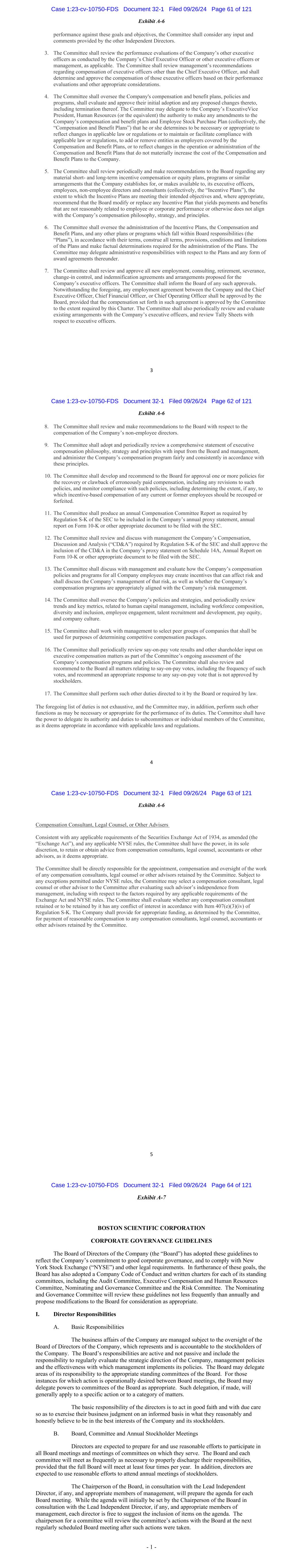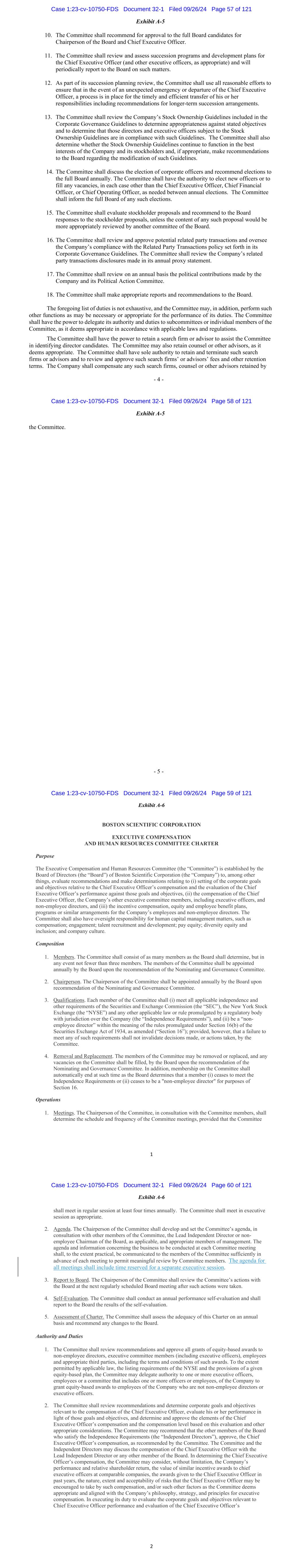 Exhibit A-5 - 4 - 10. The Committee shall recommend for approval to the full Board candidates for Chairperson of the Board and Chief Executive Officer. 11. The Committee shall review and assess succession programs and development plans for the Chief Executive Officer (and other executive officers, as appropriate) and will periodically report to the Board on such matters. 12. As part of its succession planning review, the Committee shall use all reasonable efforts to ensure that in the event of an unexpected emergency or departure of the Chief Executive Officer, a process is in place for the timely and efficient transfer of his or her responsibilities including recommendations for longer-term succession arrangements. 13. The Committee shall review the Company’s Stock Ownership Guidelines included in the Corporate Governance Guidelines to determine appropriateness against stated objectives and to determine that those directors and executive officers subject to the Stock Ownership Guidelines are in compliance with such Guidelines. The Committee shall also determine whether the Stock Ownership Guidelines continue to function in the best interests of the Company and its stockholders and, if appropriate, make recommendations to the Board regarding the modification of such Guidelines. 14. The Committee shall discuss the election of corporate officers and recommend elections to the full Board annually. The Committee shall have the authority to elect new officers or to fill any vacancies, in each case other than the Chief Executive Officer, Chief Financial Officer, or Chief Operating Officer, as needed between annual elections. The Committee shall inform the full Board of any such elections. 15. The Committee shall evaluate stockholder proposals and recommend to the Board responses to the stockholder proposals, unless the content of any such proposal would be more appropriately reviewed by another committee of the Board. 16. The Committee shall review and approve potential related party transactions and oversee the Company’s compliance with the Related Party Transactions policy set forth in its Corporate Governance Guidelines. The Committee shall review the Company’s related party transactions disclosures made in its annual proxy statement. 17. The Committee shall review on an annual basis the political contributions made by the Company and its Political Action Committee. 18. The Committee shall make appropriate reports and recommendations to the Board. The foregoing list of duties is not exhaustive, and the Committee may, in addition, perform such other functions as may be necessary or appropriate for the performance of its duties. The Committee shall have the power to delegate its authority and duties to subcommittees or individual members of the Committee, as it deems appropriate in accordance with applicable laws and regulations. The Committee shall have the power to retain a search firm or advisor to assist the Committee in identifying director candidates. The Committee may also retain counsel or other advisors, as it deems appropriate. The Committee shall have sole authority to retain and terminate such search firms or advisors and to review and approve such search firms’ or advisors’ fees and other retention terms. The Company shall compensate any such search firms, counsel or other advisors retained by Case 1:23-cv-10750-FDS Document 32-1 Filed 09/26/24 Page 57 of 121 Exhibit A-5 the Committee. xhibit -5 - 5 - e o mitt e. Case 1:23-cv-10750-FDS Document 32-1 Filed 09/26/24 Page 58 of 121 Exhibit A-6 1 BOSTON SCIENTIFIC CORPORATION EXECUTIVE COMPENSATION AND HUMAN RESOURCES COMMITTEE CHARTER Purpose The Executive Compensation and Human Resources Committee (the “Committee”) is established by the Board of Directors (the “Board”) of Boston Scientific Corporation (the “Company”) to, among other things, evaluate recommendations and make determinations relating to (i) setting of the corporate goals and objectives relative to the Chief Executive Officer’s compensation and the evaluation of the Chief Executive Officer’s performance against those goals and objectives, (ii) the compensation of the Chief Executive Officer, the Company’s other executive committee members, including executive officers, and non-employee directors, and (iii) the incentive compensation, equity and employee benefit plans, programs or similar arrangements for the Company’s employees and non-employee directors. The Committee shall also have oversight responsibility for human capital management matters, such as compensation; engagement; talent recruitment and development; pay equity; diversity equity and inclusion; and company culture. Composition 1. Members. The Committee shall consist of as many members as the Board shall determine, but in any event not fewer than three members. The members of the Committee shall be appointed annually by the Board upon the recommendation of the Nominating and Governance Committee. 2. Chairperson. The Chairperson of the Committee shall be appointed annually by the Board upon recommendation of the Nominating and Governance Committee. 3. Qualifications. Each member of the Committee shall (i) meet all applicable independence and other requirements of the Securities and Exchange Commission (the “SEC”), the New York Stock Exchange (the “NYSE”) and any other applicable law or rule promulgated by a regulatory body with jurisdiction over the Company (the “Independence Requirements”), and (ii) be a “non- employee director” within the meaning of the rules promulgated under Section 16(b) of the Securities Exchange Act of 1934, as amended (“Section 16”); provided, however, that a failure to meet any of such requirements shall not invalidate decisions made, or actions taken, by the Committee. 4. Removal and Replacement. The members of the Committee may be removed or replaced, and any vacancies on the Committee shall be filled, by the Board upon the recomm
