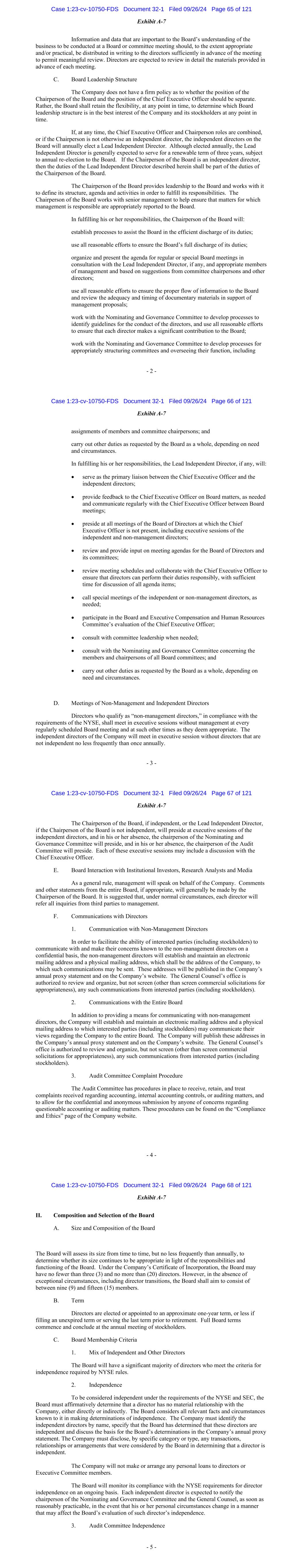 Exhibit A-7 - 2 - Information and data that are important to the Board’s understanding of the business to be conducted at a Board or committee meeting should, to the extent appropriate and/or practical, be distributed in writing to the directors sufficiently in advance of the meeting to permit meaningful review. Directors are expected to review in detail the materials provided in advance of each meeting. C. Board Leadership Structure The Company does not have a firm policy as to whether the position of the Chairperson of the Board and the position of the Chief Executive Officer should be separate. Rather, the Board shall retain the flexibility, at any point in time, to determine which Board leadership structure is in the best interest of the Company and its stockholders at any point in time. If, at any time, the Chief Executive Officer and Chairperson roles are combined, or if the Chairperson is not otherwise an independent director, the independent directors on the Board will annually elect a Lead Independent Director. Although elected annually, the Lead Independent Director is generally expected to serve for a renewable term of three years, subject to annual re-election to the Board. If the Chairperson of the Board is an independent director, then the duties of the Lead Independent Director described herein shall be part of the duties of the Chairperson of the Board. The Chairperson of the Board provides leadership to the Board and works with it to define its structure, agenda and activities in order to fulfill its responsibilities. The Chairperson of the Board works with senior management to help ensure that matters for which management is responsible are appropriately reported to the Board. In fulfilling his or her responsibilities, the Chairperson of the Board will: establish processes to assist the Board in the efficient discharge of its duties; use all reasonable efforts to ensure the Board’s full discharge of its duties; organize and present the agenda for regular or special Board meetings in consultation with the Lead Independent Director, if any, and appropriate members of management and based on suggestions from committee chairpersons and other directors; use all reasonable efforts to ensure the proper flow of information to the Board and review the adequacy and timing of documentary materials in support of management proposals; work with the Nominating and Governance Committee to develop processes to identify guidelines for the conduct of the directors, and use all reasonable efforts to ensure that each director makes a significant contribution to the Board; work with the Nominating and Governance Committee to develop processes for appropriately structuring committees and overseeing their function, including Case 1:23-cv-10750-FDS Document 32-1 Filed 09/26/24 Page 65 of 121 Exhibit A-7 - 3 - assignments of members and committee chairpersons; and carry out other duties as requested by the Board as a whole, depending on need and circumstances. In fulfilling his or her responsibilities, the Lead Independent Director, if any, will:  serve as the primary liaison between the Chief Executive Officer and the independent directors;  provide feedback to the Chief Executive Officer on Board matters, as needed and communicate regularly with the Chief Executive Officer between Board meetings;  preside at all meetings of the Board of Directors at which the Chief Executive Officer is not present, including executive sessions of the independent and non-management directors;  review and provide input on meeting agendas for the Board of Directors and its committees;  review meeting schedules and collaborate with the Chief Executive Officer to ensure that directors can perform their duties responsibly, with sufficient time for discussion of all agenda items;  call special meetings of the independent or non-management directors, as needed;  participate in the Board and Executive Compensation and Human Resources Committee’s evaluation of the Chief Executive Officer;  consult with committee leadership when needed;  consult with the Nominating and Governance Committee concerning the members and chairpersons of all Board committees; and  carry out other duties as requested by the Board as a whole, depending on need and circumstances. D. Meetings of Non-Management and Independent Directors Directors who qualify as “non-management directors,” in compliance with the requirements of the NYSE, shall meet in executive sessions without management at every regularly scheduled Board meeting and at such other times as they deem appropriate. The independent directors of the Company will meet in executive session without directors that are not independent no less frequently than once annually. Case 1:23-cv-10750-FDS Document 32-1 Filed 09/26/24 Page 66 of 121 Exhibit A-7 - 4 - The Chairperson of the Board, if independent, or the Lead Independent Director, if the Chairperson of the Board is not independent, will preside at executive sessions of the independent directors, and in his or her absence, the chairperson of the Nominating and Governance Committee will preside, and in his or her absence, the chairperson of the Audit Committee will preside. Each of these executive sessions may include a discussion with the Chief Executive Officer. E. Board Interaction with Institutional Investors, Research Analysts and Media As a general rule, management will speak on behalf of the Company. Comments and other statements from the entire Board, if appropriate, will generally be made by the Chairperson of the Board. It is suggested that, under normal circumstances, each director will refer all inquiries from third parties to management. F. Communications with Directors 1. Communication with Non-Management Directors In order to facilitate the ability of interested parties (including stockholders) to communicate with and make their concerns known to the non-management directors on a conf