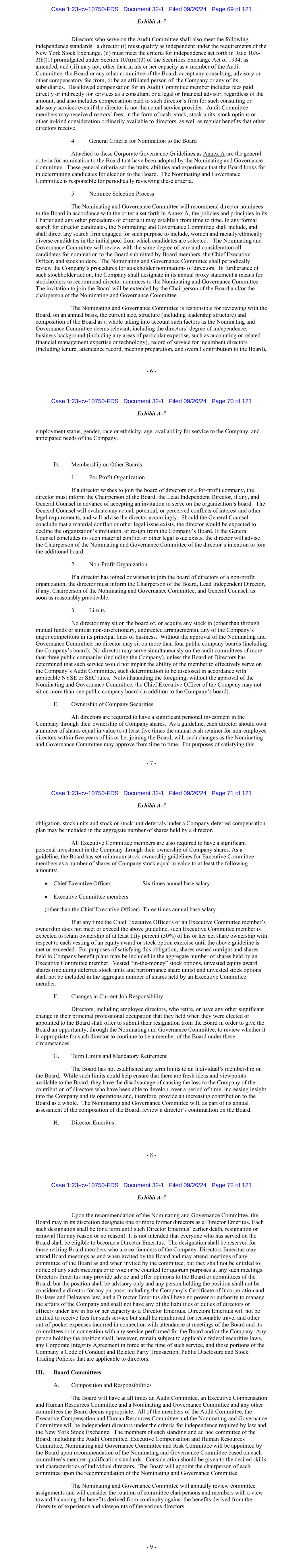Exhibit A-7 - 6 - Directors who serve on the Audit Committee shall also meet the following independence standards: a director (i) must qualify as independent under the requirements of the New York Stock Exchange, (ii) must meet the criteria for independence set forth in Rule 10A- 3(b)(1) promulgated under Section 10A(m)(3) of the Securities Exchange Act of 1934, as amended, and (iii) may not, other than in his or her capacity as a member of the Audit Committee, the Board or any other committee of the Board, accept any consulting, advisory or other compensatory fee from, or be an affiliated person of, the Company or any of its subsidiaries. Disallowed compensation for an Audit Committee member includes fees paid directly or indirectly for services as a consultant or a legal or financial advisor, regardless of the amount, and also includes compensation paid to such director’s firm for such consulting or advisory services even if the director is not the actual service provider. Audit Committee members may receive directors’ fees, in the form of cash, stock, stock units, stock options or other in-kind consideration ordinarily available to directors, as well as regular benefits that other directors receive. 4. General Criteria for Nomination to the Board Attached to these Corporate Governance Guidelines as Annex A are the general criteria for nomination to the Board that have been adopted by the Nominating and Governance Committee. These general criteria set the traits, abilities and experience that the Board looks for in determining candidates for election to the Board. The Nominating and Governance Committee is responsible for periodically reviewing these criteria. 5. Nominee Selection Process The Nominating and Governance Committee will recommend director nominees to the Board in accordance with the criteria set forth in Annex A, the policies and principles in its Charter and any other procedures or criteria it may establish from time to time. In any formal search for director candidates, the Nominating and Governance Committee shall include, and shall direct any search firm engaged for such purpose to include, women and racially/ethnically diverse candidates in the initial pool from which candidates are selected. The Nominating and Governance Committee will review with the same degree of care and consideration all candidates for nomination to the Board submitted by Board members, the Chief Executive Officer, and stockholders. The Nominating and Governance Committee shall periodically review the Company’s procedures for stockholder nominations of directors. In furtherance of such stockholder action, the Company shall designate in its annual proxy statement a means for stockholders to recommend director nominees to the Nominating and Governance Committee. The invitation to join the Board will be extended by the Chairperson of the Board and/or the chairperson of the Nominating and Governance Committee. The Nominating and Governance Committee is responsible for reviewing with the Board, on an annual basis, the current size, structure (including leadership structure) and composition of the Board as a whole taking into account such factors as the Nominating and Governance Committee deems relevant, including the directors’ degree of independence, business background (including any areas of particular expertise, such as accounting or related financial management expertise or technology), record of service for incumbent directors (including tenure, attendance record, meeting preparation, and overall contribution to the Board), Case 1:23-cv-10750-FDS Document 32-1 Filed 09/26/24 Page 69 of 121 Exhibit A-7 - 7 - employment status, gender, race or ethnicity, age, availability for service to the Company, and anticipated needs of the Company. D. Membership on Other Boards 1. For Profit Organization If a director wishes to join the board of directors of a for-profit company, the director must inform the Chairperson of the Board, the Lead Independent Director, if any, and General Counsel in advance of accepting an invitation to serve on the organization’s board. The General Counsel will evaluate any actual, potential, or perceived conflicts of interest and other legal requirements, and will advise the director accordingly. Should the General Counsel conclude that a material conflict or other legal issue exists, the director would be expected to decline the organization’s invitation, or resign from the Company’s Board. If the General Counsel concludes no such material conflict or other legal issue exists, the director will advise the Chairperson of the Nominating and Governance Committee of the director’s intention to join the additional board. 2. Non-Profit Organization If a director has joined or wishes to join the board of directors of a non-profit organization, the director must inform the Chairperson of the Board, Lead Independent Director, if any, Chairperson of the Nominating and Governance Committee, and General Counsel, as soon as reasonably practicable. 3. Limits No director may sit on the board of, or acquire any stock in (other than through mutual funds or similar non-discretionary, undirected arrangements), any of the Company’s major competitors in its principal lines of business. Without the approval of the Nominating and Governance Committee, no director may sit on more than four public company boards (including the Company’s board). No director may serve simultaneously on the audit committees of more than three public companies (including the Company), unless the Board of Directors has determined that such service would not impair the ability of the member to effectively serve on the Company’s Audit Committee, such determination to be disclosed in accordance with applicable NYSE or SEC rules. Notwithstanding the foregoing, without the approval of the Nominating and Governance Committee, the Chief Executive Officer of the Company may not sit on more than one public com