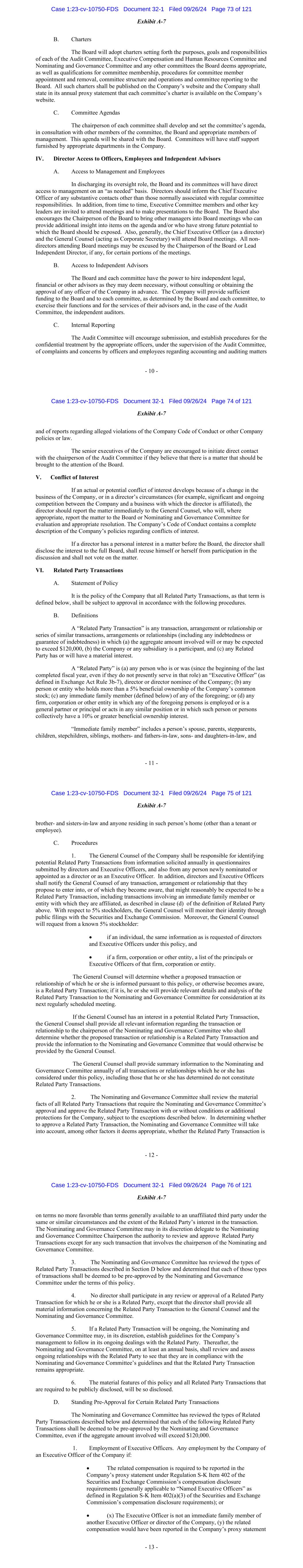Exhibit A-7 - 10 - B. Charters The Board will adopt charters setting forth the purposes, goals and responsibilities of each of the Audit Committee, Executive Compensation and Human Resources Committee and Nominating and Governance Committee and any other committees the Board deems appropriate, as well as qualifications for committee membership, procedures for committee member appointment and removal, committee structure and operations and committee reporting to the Board. All such charters shall be published on the Company’s website and the Company shall state in its annual proxy statement that each committee’s charter is available on the Company’s website. C. Committee Agendas The chairperson of each committee shall develop and set the committee’s agenda, in consultation with other members of the committee, the Board and appropriate members of management. This agenda will be shared with the Board. Committees will have staff support furnished by appropriate departments in the Company. IV. Director Access to Officers, Employees and Independent Advisors A. Access to Management and Employees In discharging its oversight role, the Board and its committees will have direct access to management on an “as needed” basis. Directors should inform the Chief Executive Officer of any substantive contacts other than those normally associated with regular committee responsibilities. In addition, from time to time, Executive Committee members and other key leaders are invited to attend meetings and to make presentations to the Board. The Board also encourages the Chairperson of the Board to bring other managers into Board meetings who can provide additional insight into items on the agenda and/or who have strong future potential to which the Board should be exposed. Also, generally, the Chief Executive Officer (as a director) and the General Counsel (acting as Corporate Secretary) will attend Board meetings. All non- directors attending Board meetings may be excused by the Chairperson of the Board or Lead Independent Director, if any, for certain portions of the meetings. B. Access to Independent Advisors The Board and each committee have the power to hire independent legal, financial or other advisors as they may deem necessary, without consulting or obtaining the approval of any officer of the Company in advance. The Company will provide sufficient funding to the Board and to each committee, as determined by the Board and each committee, to exercise their functions and for the services of their advisors and, in the case of the Audit Committee, the independent auditors. C. Internal Reporting The Audit Committee will encourage submission, and establish procedures for the confidential treatment by the appropriate officers, under the supervision of the Audit Committee, of complaints and concerns by officers and employees regarding accounting and auditing matters Case 1:23-cv-10750-FDS Document 32-1 Filed 09/26/24 Page 73 of 121 Exhibit A-7 - 11 - and of reports regarding alleged violations of the Company Code of Conduct or other Company policies or law. The senior executives of the Company are encouraged to initiate direct contact with the chairperson of the Audit Committee if they believe that there is a matter that should be brought to the attention of the Board. V. Conflict of Interest If an actual or potential conflict of interest develops because of a change in the business of the Company, or in a director’s circumstances (for example, significant and ongoing competition between the Company and a business with which the director is affiliated), the director should report the matter immediately to the General Counsel, who will, where appropriate, report the matter to the Board or Nominating and Governance Committee for evaluation and appropriate resolution. The Company’s Code of Conduct contains a complete description of the Company’s policies regarding conflicts of interest. If a director has a personal interest in a matter before the Board, the director shall disclose the interest to the full Board, shall recuse himself or herself from participation in the discussion and shall not vote on the matter. VI. Related Party Transactions A. Statement of Policy It is the policy of the Company that all Related Party Transactions, as that term is defined below, shall be subject to approval in accordance with the following procedures. B. Definitions A “Related Party Transaction” is any transaction, arrangement or relationship or series of similar transactions, arrangements or relationships (including any indebtedness or guarantee of indebtedness) in which (a) the aggregate amount involved will or may be expected to exceed $120,000, (b) the Company or any subsidiary is a participant, and (c) any Related Party has or will have a material interest. A “Related Party” is (a) any person who is or was (since the beginning of the last completed fiscal year, even if they do not presently serve in that role) an “Executive Officer” (as defined in Exchange Act Rule 3b-7), director or director nominee of the Company; (b) any person or entity who holds more than a 5% beneficial ownership of the Company’s common stock; (c) any immediate family member (defined below) of any of the foregoing; or (d) any firm, corporation or other entity in which any of the foregoing persons is employed or is a general partner or principal or acts in any similar position or in which such person or persons collectively have a 10% or greater beneficial ownership interest. “Immediate family member” includes a person’s spouse, parents, stepparents, children, stepchildren, siblings, mothers- and fathers-in-law, sons- and daughters-in-law, and Case 1:23-cv-10750-FDS Document 32-1 Filed 09/26/24 Page 74 of 121 Exhibit A-7 - 12 - brother- and sisters-in-law and anyone residing in such person’s home (other than a tenant or employee). C. Procedures 1. The General Counsel of the Company shall be responsible for iden