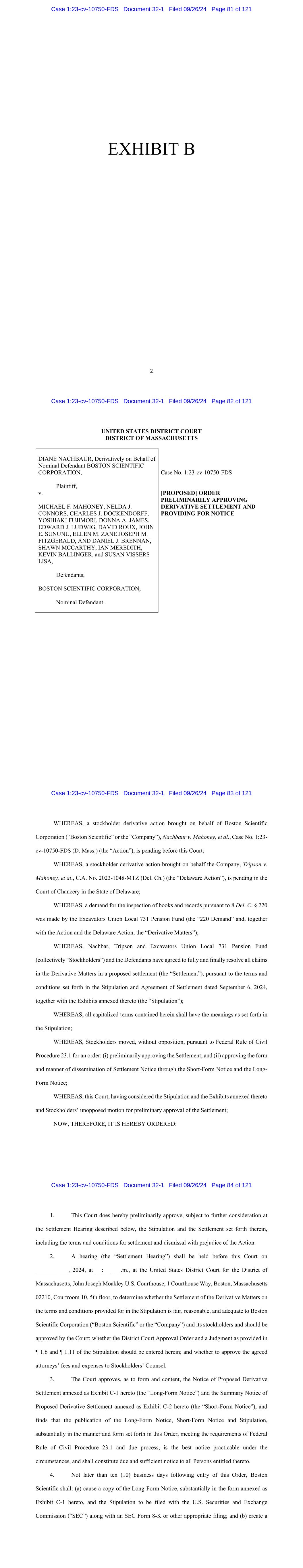 EXHIBIT B 2 HIBIT Case 1:23-cv-10750-FDS Document 32-1 Filed 09/26/24 Page 81 of 121 UNITED STATES DISTRICT COURT DISTRICT OF MASSACHUSETTS DIANE NACHBAUR, Derivatively on Behalf of Nominal Defendant BOSTON SCIENTIFIC CORPORATION, Plaintiff, v. MICHAEL F. MAHONEY, NELDA J. CONNORS, CHARLES J. DOCKENDORFF, YOSHIAKI FUJIMORI, DONNA A. JAMES, EDWARD J. LUDWIG, DAVID ROUX, JOHN E. SUNUNU, ELLEN M. ZANE JOSEPH M. FITZGERALD, AND DANIEL J. BRENNAN, SHAWN MCCARTHY, IAN MEREDITH, KEVIN BALLINGER, and SUSAN VISSERS LISA, Defendants, BOSTON SCIENTIFIC CORPORATION, Nominal Defendant. Case No. 1:23-cv-10750-FDS [PROPOSED] ORDER PRELIMINARILY APPROVING DERIVATIVE SETTLEMENT AND PROVIDING FOR NOTICE Case 1:23-cv-10750-FDS Document 32-1 Filed 09/26/24 Page 82 of 121 WHEREAS, a stockholder derivative action brought on behalf of Boston Scientific Corporation (“Boston Scientific” or the “Company”), Nachbaur v. Mahoney, et al., Case No. 1:23- cv-10750-FDS (D. Mass.) (the “Action”), is pending before this Court; WHEREAS, a stockholder derivative action brought on behalf the Company, Tripson v. Mahoney, et al., C.A. No. 2023-1048-MTZ (Del. Ch.) (the “Delaware Action”), is pending in the Court of Chancery in the State of Delaware; WHEREAS, a demand for the inspection of books and records pursuant to 8 Del. C. § 220 was made by the Excavators Union Local 731 Pension Fund (the “220 Demand” and, together with the Action and the Delaware Action, the “Derivative Matters”); WHEREAS, Nachbar, Tripson and Excavators Union Local 731 Pension Fund (collectively “Stockholders”) and the Defendants have agreed to fully and finally resolve all claims in the Derivative Matters in a proposed settlement (the “Settlement”), pursuant to the terms and conditions set forth in the Stipulation and Agreement of Settlement dated September 6, 2024, together with the Exhibits annexed thereto (the “Stipulation”); WHEREAS, all capitalized terms contained herein shall have the meanings as set forth in the Stipulation; WHEREAS, Stockholders moved, without opposition, pursuant to Federal Rule of Civil Procedure 23.1 for an order: (i) preliminarily approving the Settlement; and (ii) approving the form and manner of dissemination of Settlement Notice through the Short-Form Notice and the Long- Form Notice; WHEREAS, this Court, having considered the Stipulation and the Exhibits annexed thereto and Stockholders’ unopposed motion for preliminary approval of the Settlement; NOW, THEREFORE, IT IS HEREBY ORDERED: Case 1:23-cv-10750-FDS Document 32-1 Filed 09/26/24 Page 83 of 121 1. This Court does hereby preliminarily approve, subject to further consideration at the Settlement Hearing described below, the Stipulation and the Settlement set forth therein, including the terms and conditions for settlement and dismissal with prejudice of the Action. 2. A hearing (the “Settlement Hearing”) shall be held before this Court on ___________, 2024, at __:___ __.m., at the United States District Court for the District of Massachusetts, John Joseph Moakley U.S. Courthouse, 1 Courthouse Way, Boston, Massachusetts 02210, Courtroom 10, 5th floor, to determine whether the Settlement of the Derivative Matters on the terms and conditions provided for in the Stipulation is fair, reasonable, and adequate to Boston Scientific Corporation (“Boston Scientific” or the “Company”) and its stockholders and should be approved by the Court; whether the District Court Approval Order and a Judgment as provided in ¶ 1.6 and ¶ 1.11 of the Stipulation should be entered herein; and whether to approve the agreed attorneys’ fees and expenses to Stockholders’ Counsel. 3. The Court approves, as to form and content, the Notice of Proposed Derivative Settlement annexed as Exhibit C-1 hereto (the “Long-Form Notice”) and the Summary Notice of Proposed Derivative Settlement annexed as Exhibit C-2 hereto (the “Short-Form Notice”), and finds that the publication of the Long-Form Notice, Short-Form Notice and Stipulation, substantially in the manner and form set forth in this Order, meeting the requirements of Federal Rule of Civil Procedure 23.1 and due process, is the best notice practicable under the circumstances, and shall constitute due and sufficient notice to all Persons entitled thereto. 4. Not later than ten (10) business days following entry of this Order, Boston Scientific shall: (a) cause a copy of the Long-Form Notice, substantially in the form annexed as Exhibit C-1 hereto, and the Stipulation to be filed with the U.S. Securities and Exchange Commission (“SEC”) along with an SEC Form 8-K or other appropriate filing; and (b) create a Case 1:23-cv-10750-FDS Document 32-1 Filed 09/26/24 Page 84 of 121