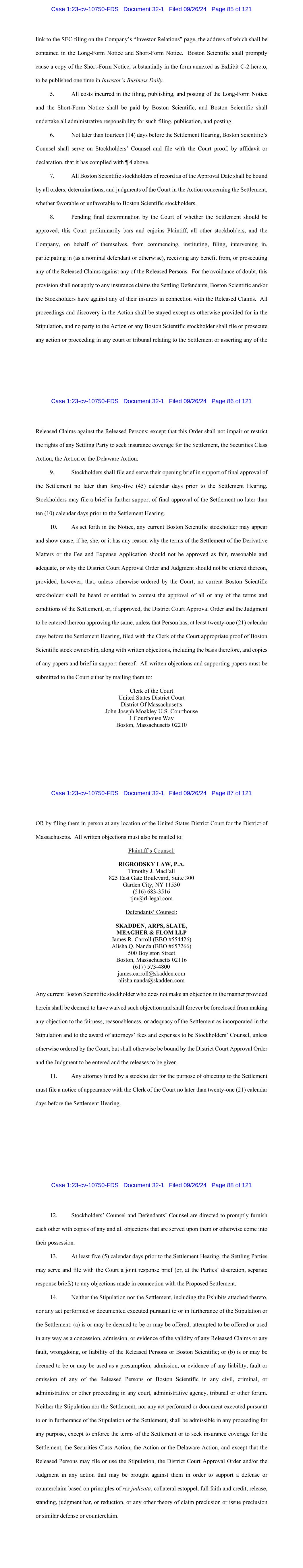 link to the SEC filing on the Company’s “Investor Relations” page, the address of which shall be contained in the Long-Form Notice and Short-Form Notice. Boston Scientific shall promptly cause a copy of the Short-Form Notice, substantially in the form annexed as Exhibit C-2 hereto, to be published one time in Investor’s Business Daily. 5. All costs incurred in the filing, publishing, and posting of the Long-Form Notice and the Short-Form Notice shall be paid by Boston Scientific, and Boston Scientific shall undertake all administrative responsibility for such filing, publication, and posting. 6. Not later than fourteen (14) days before the Settlement Hearing, Boston Scientific’s Counsel shall serve on Stockholders’ Counsel and file with the Court proof, by affidavit or declaration, that it has complied with ¶ 4 above. 7. All Boston Scientific stockholders of record as of the Approval Date shall be bound by all orders, determinations, and judgments of the Court in the Action concerning the Settlement, whether favorable or unfavorable to Boston Scientific stockholders. 8. Pending final determination by the Court of whether the Settlement should be approved, this Court preliminarily bars and enjoins Plaintiff, all other stockholders, and the Company, on behalf of themselves, from commencing, instituting, filing, intervening in, participating in (as a nominal defendant or otherwise), receiving any benefit from, or prosecuting any of the Released Claims against any of the Released Persons. For the avoidance of doubt, this provision shall not apply to any insurance claims the Settling Defendants, Boston Scientific and/or the Stockholders have against any of their insurers in connection with the Released Claims. All proceedings and discovery in the Action shall be stayed except as otherwise provided for in the Stipulation, and no party to the Action or any Boston Scientific stockholder shall file or prosecute any action or proceeding in any court or tribunal relating to the Settlement or asserting any of the Case 1:23-cv-10750-FDS Document 32-1 Filed 09/26/24 Page 85 of 121 Released Claims against the Released Persons; except that this Order shall not impair or restrict the rights of any Settling Party to seek insurance coverage for the Settlement, the Securities Class Action, the Action or the Delaware Action. 9. Stockholders shall file and serve their opening brief in support of final approval of the Settlement no later than forty-five (45) calendar days prior to the Settlement Hearing. Stockholders may file a brief in further support of final approval of the Settlement no later than ten (10) calendar days prior to the Settlement Hearing. 10. As set forth in the Notice, any current Boston Scientific stockholder may appear and show cause, if he, she, or it has any reason why the terms of the Settlement of the Derivative Matters or the Fee and Expense Application should not be approved as fair, reasonable and adequate, or why the District Court Approval Order and Judgment should not be entered thereon, provided, however, that, unless otherwise ordered by the Court, no current Boston Scientific stockholder shall be heard or entitled to contest the approval of all or any of the terms and conditions of the Settlement, or, if approved, the District Court Approval Order and the Judgment to be entered thereon approving the same, unless that Person has, at least twenty-one (21) calendar days before the Settlement Hearing, filed with the Clerk of the Court appropriate proof of Boston Scientific stock ownership, along with written objections, including the basis therefore, and copies of any papers and brief in support thereof. All written objections and supporting papers must be submitted to the Court either by mailing them to: Clerk of the Court United States District Court District Of Massachusetts John Joseph Moakley U.S. Courthouse 1 Courthouse Way Boston, Massachusetts 02210 Case 1:23-cv-10750-FDS Document 32-1 Filed 09/26/24 Page 86 of 121 OR by filing them in person at any location of the United States District Court for the District of Massachusetts. All written objections must also be mailed to: Plaintiff’s Counsel: RIGRODSKY LAW, P.A. Timothy J. MacFall 825 East Gate Boulevard, Suite 300 Garden City, NY 11530 (516) 683-3516 tjm@rl-legal.com Defendants’ Counsel: SKADDEN, ARPS, SLATE, MEAGHER & FLOM LLP James R. Carroll (BBO #554426) Alisha Q. Nanda (BBO #657266) 500 Boylston Street Boston, Massachusetts 02116 (617) 573-4800 james.carroll@skadden.com alisha.nanda@skadden.com Any current Boston Scientific stockholder who does not make an objection in the manner provided herein shall be deemed to have waived such objection and shall forever be foreclosed from making any objection to the fairness, reasonableness, or adequacy of the Settlement as incorporated in the Stipulation and to the award of attorneys’ fees and expenses to be Stockholders’ Counsel, unless otherwise ordered by the Court, but shall otherwise be bound by the District Court Approval Order and the Judgment to be entered and the releases to be given. 11. Any attorney hired by a stockholder for the purpose of objecting to the Settlement must file a notice of appearance with the Clerk of the Court no later than twenty-one (21) calendar days before the Settlement Hearing. Case 1:23-cv-10750-FDS Document 32-1 Filed 09/26/24 Page 87 of 121 12. Stockholders’ Counsel and Defendants’ Counsel are directed to promptly furnish each other with copies of any and all objections that are served upon them or otherwise come into their possession. 13. At least five (5) calendar days prior to the Settlement Hearing, the Settling Parties may serve and file with the Court a joint response brief (or, at the Parties’ discretion, separate response briefs) to any objections made in connection with the Proposed Settlement. 14. Neither the Stipulation nor the Settlement, including the Exhibits attached thereto, nor any act performed