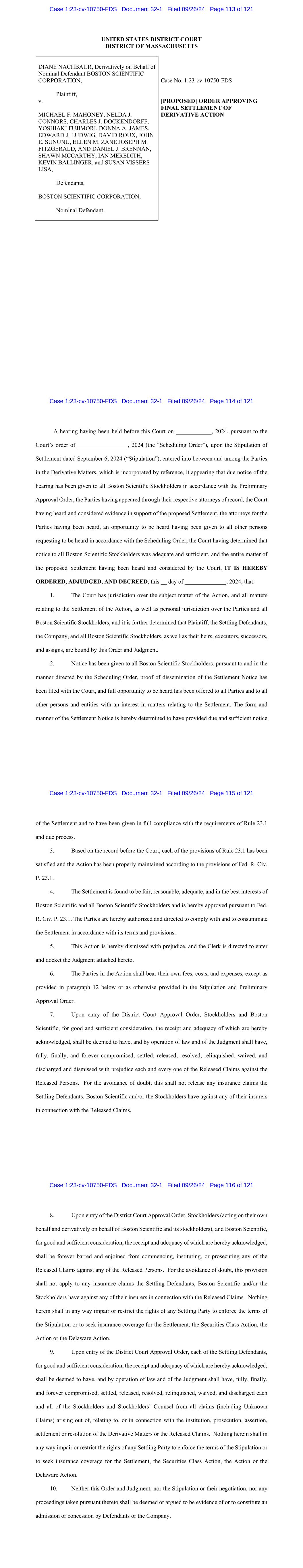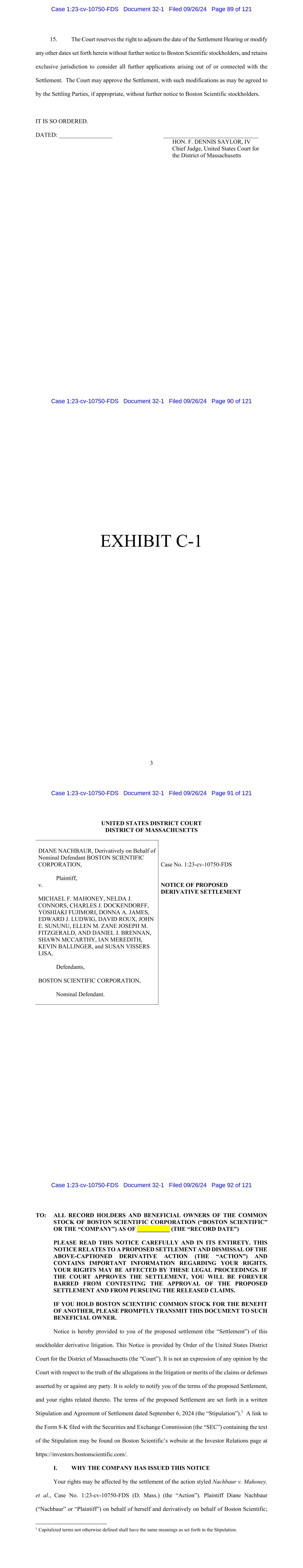 15. The Court reserves the right to adjourn the date of the Settlement Hearing or modify any other dates set forth herein without further notice to Boston Scientific stockholders, and retains exclusive jurisdiction to consider all further applications arising out of or connected with the Settlement. The Court may approve the Settlement, with such modifications as may be agreed to by the Settling Parties, if appropriate, without further notice to Boston Scientific stockholders. IT IS SO ORDERED. DATED: __________________ ________________________________ HON. F. DENNIS SAYLOR, IV Chief Judge, United States Court for the District of Massachusetts Case 1:23-cv-10750-FDS Document 32-1 Filed 09/26/24 Page 89 of 121 EXHIBIT C-1 3 HIBIT - Case 1:23-cv-10750-FDS Document 32-1 Filed 09/26/24 Page 90 of 121 UNITED STATES DISTRICT COURT DISTRICT OF MASSACHUSETTS DIANE NACHBAUR, Derivatively on Behalf of Nominal Defendant BOSTON SCIENTIFIC CORPORATION, Plaintiff, v. MICHAEL F. MAHONEY, NELDA J. CONNORS, CHARLES J. DOCKENDORFF, YOSHIAKI FUJIMORI, DONNA A. JAMES, EDWARD J. LUDWIG, DAVID ROUX, JOHN E. SUNUNU, ELLEN M. ZANE JOSEPH M. FITZGERALD, AND DANIEL J. BRENNAN, SHAWN MCCARTHY, IAN MEREDITH, KEVIN BALLINGER, and SUSAN VISSERS LISA, Defendants, BOSTON SCIENTIFIC CORPORATION, Nominal Defendant. Case No. 1:23-cv-10750-FDS NOTICE OF PROPOSED DERIVATIVE SETTLEMENT Case 1:23-cv-10750-FDS Document 32-1 Filed 09/26/24 Page 91 of 121 TO: ALL RECORD HOLDERS AND BENEFICIAL OWNERS OF THE COMMON STOCK OF BOSTON SCIENTIFIC CORPORATION (“BOSTON SCIENTIFIC” OR THE “COMPANY”) AS OF ___________ (THE “RECORD DATE”) PLEASE READ THIS NOTICE CAREFULLY AND IN ITS ENTIRETY. THIS NOTICE RELATES TO A PROPOSED SETTLEMENT AND DISMISSAL OF THE ABOVE-CAPTIONED DERIVATIVE ACTION (THE “ACTION”) AND CONTAINS IMPORTANT INFORMATION REGARDING YOUR RIGHTS. YOUR RIGHTS MAY BE AFFECTED BY THESE LEGAL PROCEEDINGS. IF THE COURT APPROVES THE SETTLEMENT, YOU WILL BE FOREVER BARRED FROM CONTESTING THE APPROVAL OF THE PROPOSED SETTLEMENT AND FROM PURSUING THE RELEASED CLAIMS. IF YOU HOLD BOSTON SCIENTIFIC COMMON STOCK FOR THE BENEFIT OF ANOTHER, PLEASE PROMPTLY TRANSMIT THIS DOCUMENT TO SUCH BENEFICIAL OWNER. Notice is hereby provided to you of the proposed settlement (the “Settlement”) of this stockholder derivative litigation. This Notice is provided by Order of the United States District Court for the District of Massachusetts (the “Court”). It is not an expression of any opinion by the Court with respect to the truth of the allegations in the litigation or merits of the claims or defenses asserted by or against any party. It is solely to notify you of the terms of the proposed Settlement, and your rights related thereto. The terms of the proposed Settlement are set forth in a written Stipulation and Agreement of Settlement dated September 6, 2024 (the “Stipulation”).1 A link to the Form 8-K filed with the Securities and Exchange Commission (the “SEC”) containing the text of the Stipulation may be found on Boston Scientific’s website at the Investor Relations page at https://investors.bostonscientific.com/. I. WHY THE COMPANY HAS ISSUED THIS NOTICE Your rights may be affected by the settlement of the action styled Nachbaur v. Mahoney, et al., Case No. 1:23-cv-10750-FDS (D. Mass.) (the “Action”). Plaintiff Diane Nachbaur (“Nachbaur” or “Plaintiff”) on behalf of herself and derivatively on behalf of Boston Scientific; 1 Capitalized terms not otherwise defined shall have the same meanings as set forth in the Stipulation. Case 1:23-cv-10750-FDS Document 32-1 Filed 09/26/24 Page 92 of 121