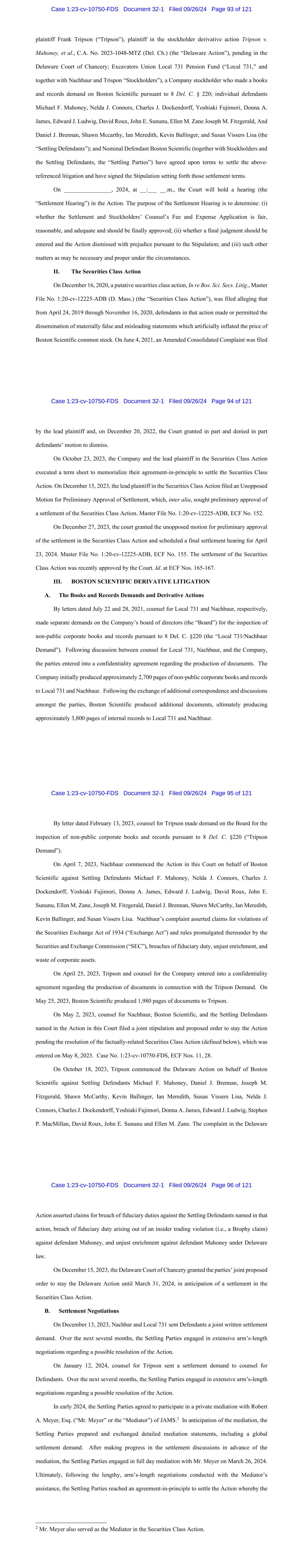 plaintiff Frank Tripson (“Tripson”), plaintiff in the stockholder derivative action Tripson v. Mahoney, et al., C.A. No. 2023-1048-MTZ (Del. Ch.) (the “Delaware Action”), pending in the Delaware Court of Chancery; Excavators Union Local 731 Pension Fund (“Local 731,” and together with Nachbaur and Trispon “Stockholders”), a Company stockholder who made a books and records demand on Boston Scientific pursuant to 8 Del. C. § 220; individual defendants Michael F. Mahoney, Nelda J. Connors, Charles J. Dockendorff, Yoshiaki Fujimori, Donna A. James, Edward J. Ludwig, David Roux, John E. Sununu, Ellen M. Zane Joseph M. Fitzgerald, And Daniel J. Brennan, Shawn Mccarthy, Ian Meredith, Kevin Ballinger, and Susan Vissers Lisa (the “Settling Defendants”); and Nominal Defendant Boston Scientific (together with Stockholders and the Settling Defendants, the “Settling Parties”) have agreed upon terms to settle the above- referenced litigation and have signed the Stipulation setting forth those settlement terms. On ________________, 2024, at __:___ __.m., the Court will hold a hearing (the “Settlement Hearing”) in the Action. The purpose of the Settlement Hearing is to determine: (i) whether the Settlement and Stockholders’ Counsel’s Fee and Expense Application is fair, reasonable, and adequate and should be finally approved; (ii) whether a final judgment should be entered and the Action dismissed with prejudice pursuant to the Stipulation; and (iii) such other matters as may be necessary and proper under the circumstances. II. The Securities Class Action On December 16, 2020, a putative securities class action, In re Bos. Sci. Secs. Litig., Master File No. 1:20-cv-12225-ADB (D. Mass.) (the “Securities Class Action”), was filed alleging that from April 24, 2019 through November 16, 2020, defendants in that action made or permitted the dissemination of materially false and misleading statements which artificially inflated the price of Boston Scientific common stock. On June 4, 2021, an Amended Consolidated Complaint was filed Case 1:23-cv-10750-FDS Document 32-1 Filed 09/26/24 Page 93 of 121 by the lead plaintiff and, on December 20, 2022, the Court granted in part and denied in part defendants’ motion to dismiss. On October 23, 2023, the Company and the lead plaintiff in the Securities Class Action executed a term sheet to memorialize their agreement-in-principle to settle the Securities Class Action. On December 15, 2023, the lead plaintiff in the Securities Class Action filed an Unopposed Motion for Preliminary Approval of Settlement, which, inter alia, sought preliminary approval of a settlement of the Securities Class Action. Master File No. 1:20-cv-12225-ADB, ECF No. 152. On December 27, 2023, the court granted the unopposed motion for preliminary approval of the settlement in the Securities Class Action and scheduled a final settlement hearing for April 23, 2024. Master File No. 1:20-cv-12225-ADB, ECF No. 155. The settlement of the Securities Class Action was recently approved by the Court. Id. at ECF Nos. 165-167. III. BOSTON SCIENTIFIC DERIVATIVE LITIGATION A. The Books and Records Demands and Derivative Actions By letters dated July 22 and 28, 2021, counsel for Local 731 and Nachbaur, respectively, made separate demands on the Company’s board of directors (the “Board”) for the inspection of non-public corporate books and records pursuant to 8 Del. C. §220 (the “Local 731/Nachbaur Demand”). Following discussion between counsel for Local 731, Nachbaur, and the Company, the parties entered into a confidentiality agreement regarding the production of documents. The Company initially produced approximately 2,700 pages of non-public corporate books and records to Local 731 and Nachbaur. Following the exchange of additional correspondence and discussions amongst the parties, Boston Scientific produced additional documents, ultimately producing approximately 3,800 pages of internal records to Local 731 and Nachbaur. Case 1:23-cv-10750-FDS Document 32-1 Filed 09/26/24 Page 94 of 121 By letter dated February 13, 2023, counsel for Tripson made demand on the Board for the inspection of non-public corporate books and records pursuant to 8 Del. C. §220 (“Tripson Demand”). On April 7, 2023, Nachbaur commenced the Action in this Court on behalf of Boston Scientific against Settling Defendants Michael F. Mahoney, Nelda J. Connors, Charles J. Dockendorff, Yoshiaki Fujimori, Donna A. James, Edward J. Ludwig, David Roux, John E. Sununu, Ellen M. Zane, Joseph M. Fitzgerald, Daniel J. Brennan, Shawn McCarthy, Ian Meredith, Kevin Ballinger, and Susan Vissers Lisa. Nachbaur’s complaint asserted claims for violations of the Securities Exchange Act of 1934 (“Exchange Act”) and rules promulgated thereunder by the Securities and Exchange Commission (“SEC”), breaches of fiduciary duty, unjust enrichment, and waste of corporate assets. On April 25, 2023, Tripson and counsel for the Company entered into a confidentiality agreement regarding the production of documents in connection with the Tripson Demand. On May 25, 2023, Boston Scientific produced 1,980 pages of documents to Tripson. On May 2, 2023, counsel for Nachbaur, Boston Scientific, and the Settling Defendants named in the Action in this Court filed a joint stipulation and proposed order to stay the Action pending the resolution of the factually-related Securities Class Action (defined below), which was entered on May 8, 2023. Case No. 1:23-cv-10750-FDS, ECF Nos. 11, 28. On October 18, 2023, Tripson commenced the Delaware Action on behalf of Boston Scientific against Settling Defendants Michael F. Mahoney, Daniel J. Brennan, Joseph M. Fitzgerald, Shawn McCarthy, Kevin Ballinger, Ian Meredith, Susan Vissers Lisa, Nelda J. Connors, Charles J. Dockendorff, Yoshiaki Fujimori, Donna A. James, Edward J. Ludwig, Stephen P. MacMillan, David Roux, John E. Sununu and Ellen M. Zane. The complaint in the Delaware 