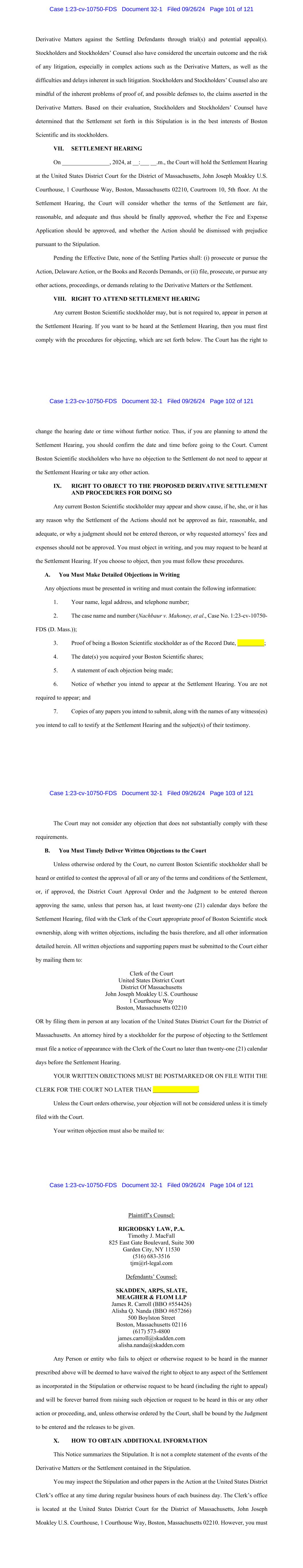 Derivative Matters against the Settling Defendants through trial(s) and potential appeal(s). Stockholders and Stockholders’ Counsel also have considered the uncertain outcome and the risk of any litigation, especially in complex actions such as the Derivative Matters, as well as the difficulties and delays inherent in such litigation. Stockholders and Stockholders’ Counsel also are mindful of the inherent problems of proof of, and possible defenses to, the claims asserted in the Derivative Matters. Based on their evaluation, Stockholders and Stockholders’ Counsel have determined that the Settlement set forth in this Stipulation is in the best interests of Boston Scientific and its stockholders. VII. SETTLEMENT HEARING On ________________, 2024, at __:___ __.m., the Court will hold the Settlement Hearing at the United States District Court for the District of Massachusetts, John Joseph Moakley U.S. Courthouse, 1 Courthouse Way, Boston, Massachusetts 02210, Courtroom 10, 5th floor. At the Settlement Hearing, the Court will consider whether the terms of the Settlement are fair, reasonable, and adequate and thus should be finally approved, whether the Fee and Expense Application should be approved, and whether the Action should be dismissed with prejudice pursuant to the Stipulation. Pending the Effective Date, none of the Settling Parties shall: (i) prosecute or pursue the Action, Delaware Action, or the Books and Records Demands, or (ii) file, prosecute, or pursue any other actions, proceedings, or demands relating to the Derivative Matters or the Settlement. VIII. RIGHT TO ATTEND SETTLEMENT HEARING Any current Boston Scientific stockholder may, but is not required to, appear in person at the Settlement Hearing. If you want to be heard at the Settlement Hearing, then you must first comply with the procedures for objecting, which are set forth below. The Court has the right to Case 1:23-cv-10750-FDS Document 32-1 Filed 09/26/24 Page 101 of 121 change the hearing date or time without further notice. Thus, if you are planning to attend the Settlement Hearing, you should confirm the date and time before going to the Court. Current Boston Scientific stockholders who have no objection to the Settlement do not need to appear at the Settlement Hearing or take any other action. IX. RIGHT TO OBJECT TO THE PROPOSED DERIVATIVE SETTLEMENT AND PROCEDURES FOR DOING SO Any current Boston Scientific stockholder may appear and show cause, if he, she, or it has any reason why the Settlement of the Actions should not be approved as fair, reasonable, and adequate, or why a judgment should not be entered thereon, or why requested attorneys’ fees and expenses should not be approved. You must object in writing, and you may request to be heard at the Settlement Hearing. If you choose to object, then you must follow these procedures. A. You Must Make Detailed Objections in Writing Any objections must be presented in writing and must contain the following information: 1. Your name, legal address, and telephone number; 2. The case name and number (Nachbaur v. Mahoney, et al., Case No. 1:23-cv-10750- FDS (D. Mass.)); 3. Proof of being a Boston Scientific stockholder as of the Record Date, _________; 4. The date(s) you acquired your Boston Scientific shares; 5. A statement of each objection being made; 6. Notice of whether you intend to appear at the Settlement Hearing. You are not required to appear; and 7. Copies of any papers you intend to submit, along with the names of any witness(es) you intend to call to testify at the Settlement Hearing and the subject(s) of their testimony. Case 1:23-cv-10750-FDS Document 32-1 Filed 09/26/24 Page 102 of 121 The Court may not consider any objection that does not substantially comply with these requirements. B. You Must Timely Deliver Written Objections to the Court Unless otherwise ordered by the Court, no current Boston Scientific stockholder shall be heard or entitled to contest the approval of all or any of the terms and conditions of the Settlement, or, if approved, the District Court Approval Order and the Judgment to be entered thereon approving the same, unless that person has, at least twenty-one (21) calendar days before the Settlement Hearing, filed with the Clerk of the Court appropriate proof of Boston Scientific stock ownership, along with written objections, including the basis therefore, and all other information detailed herein. All written objections and supporting papers must be submitted to the Court either by mailing them to: Clerk of the Court United States District Court District Of Massachusetts John Joseph Moakley U.S. Courthouse 1 Courthouse Way Boston, Massachusetts 02210 OR by filing them in person at any location of the United States District Court for the District of Massachusetts. An attorney hired by a stockholder for the purpose of objecting to the Settlement must file a notice of appearance with the Clerk of the Court no later than twenty-one (21) calendar days before the Settlement Hearing. YOUR WRITTEN OBJECTIONS MUST BE POSTMARKED OR ON FILE WITH THE CLERK FOR THE COURT NO LATER THAN _______________. Unless the Court orders otherwise, your objection will not be considered unless it is timely filed with the Court. Your written objection must also be mailed to: Case 1:23-cv-10750-FDS Document 32-1 Filed 09/26/24 Page 103 of 121 Plaintiff’s Counsel: RIGRODSKY LAW, P.A. Timothy J. MacFall 825 East Gate Boulevard, Suite 300 Garden City, NY 11530 (516) 683-3516 tjm@rl-legal.com Defendants’ Counsel: SKADDEN, ARPS, SLATE, MEAGHER & FLOM LLP James R. Carroll (BBO #554426) Alisha Q. Nanda (BBO #657266) 500 Boylston Street Boston, Massachusetts 02116 (617) 573-4800 james.carroll@skadden.com alisha.nanda@skadden.com Any Person or entity who fails to object or otherwise request to be heard in the manner prescribed above will be deemed to have waived the right to object to any aspect of the Settlement as incorporated in the Stipulation or other