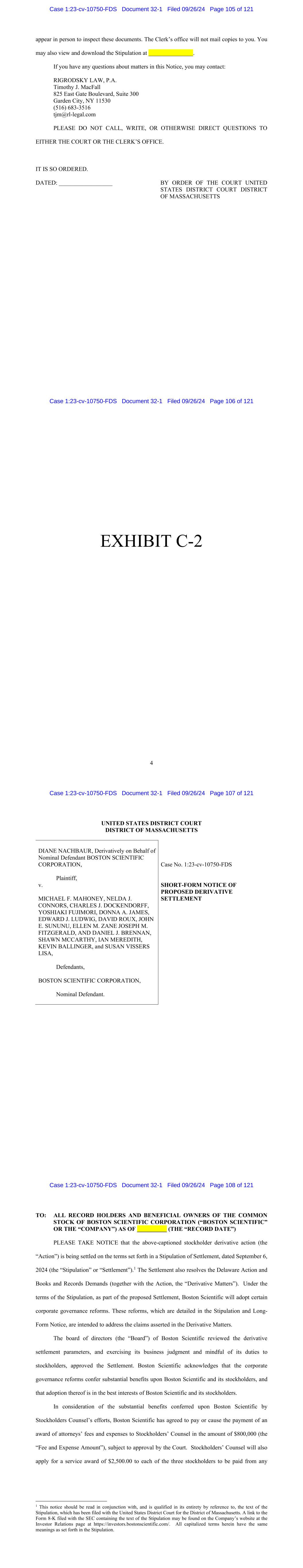 appear in person to inspect these documents. The Clerk’s office will not mail copies to you. You may also view and download the Stipulation at _______________. If you have any questions about matters in this Notice, you may contact: RIGRODSKY LAW, P.A. Timothy J. MacFall 825 East Gate Boulevard, Suite 300 Garden City, NY 11530 (516) 683-3516 tjm@rl-legal.com PLEASE DO NOT CALL, WRITE, OR OTHERWISE DIRECT QUESTIONS TO EITHER THE COURT OR THE CLERK’S OFFICE. IT IS SO ORDERED. DATED: __________________ BY ORDER OF THE COURT UNITED STATES DISTRICT COURT DISTRICT OF MASSACHUSETTS Case 1:23-cv-10750-FDS Document 32-1 Filed 09/26/24 Page 105 of 121 EXHIBIT C-2 4 HIBIT - Case 1:23-cv-10750-FDS Document 32-1 Filed 09/26/24 Page 106 of 121 UNITED STATES DISTRICT COURT DISTRICT OF MASSACHUSETTS DIANE NACHBAUR, Derivatively on Behalf of Nominal Defendant BOSTON SCIENTIFIC CORPORATION, Plaintiff, v. MICHAEL F. MAHONEY, NELDA J. CONNORS, CHARLES J. DOCKENDORFF, YOSHIAKI FUJIMORI, DONNA A. JAMES, EDWARD J. LUDWIG, DAVID ROUX, JOHN E. SUNUNU, ELLEN M. ZANE JOSEPH M. FITZGERALD, AND DANIEL J. BRENNAN, SHAWN MCCARTHY, IAN MEREDITH, KEVIN BALLINGER, and SUSAN VISSERS LISA, Defendants, BOSTON SCIENTIFIC CORPORATION, Nominal Defendant. Case No. 1:23-cv-10750-FDS SHORT-FORM NOTICE OF PROPOSED DERIVATIVE SETTLEMENT Case 1:23-cv-10750-FDS Document 32-1 Filed 09/26/24 Page 107 of 121 TO: ALL RECORD HOLDERS AND BENEFICIAL OWNERS OF THE COMMON STOCK OF BOSTON SCIENTIFIC CORPORATION (“BOSTON SCIENTIFIC” OR THE “COMPANY”) AS OF __________ (THE “RECORD DATE”) PLEASE TAKE NOTICE that the above-captioned stockholder derivative action (the “Action”) is being settled on the terms set forth in a Stipulation of Settlement, dated September 6, 2024 (the “Stipulation” or “Settlement”).1 The Settlement also resolves the Delaware Action and Books and Records Demands (together with the Action, the “Derivative Matters”). Under the terms of the Stipulation, as part of the proposed Settlement, Boston Scientific will adopt certain corporate governance reforms. These reforms, which are detailed in the Stipulation and Long- Form Notice, are intended to address the claims asserted in the Derivative Matters. The board of directors (the “Board”) of Boston Scientific reviewed the derivative settlement parameters, and exercising its business judgment and mindful of its duties to stockholders, approved the Settlement. Boston Scientific acknowledges that the corporate governance reforms confer substantial benefits upon Boston Scientific and its stockholders, and that adoption thereof is in the best interests of Boston Scientific and its stockholders. In consideration of the substantial benefits conferred upon Boston Scientific by Stockholders Counsel’s efforts, Boston Scientific has agreed to pay or cause the payment of an award of attorneys’ fees and expenses to Stockholders’ Counsel in the amount of $800,000 (the “Fee and Expense Amount”), subject to approval by the Court. Stockholders’ Counsel will also apply for a service award of $2,500.00 to each of the three stockholders to be paid from any 1 This notice should be read in conjunction with, and is qualified in its entirety by reference to, the text of the Stipulation, which has been filed with the United States District Court for the District of Massachusetts. A link to the Form 8-K filed with the SEC containing the text of the Stipulation may be found on the Company’s website at the Investor Relations page at https://investors.bostonscientific.com/. All capitalized terms herein have the same meanings as set forth in the Stipulation. Case 1:23-cv-10750-FDS Document 32-1 Filed 09/26/24 Page 108 of 121