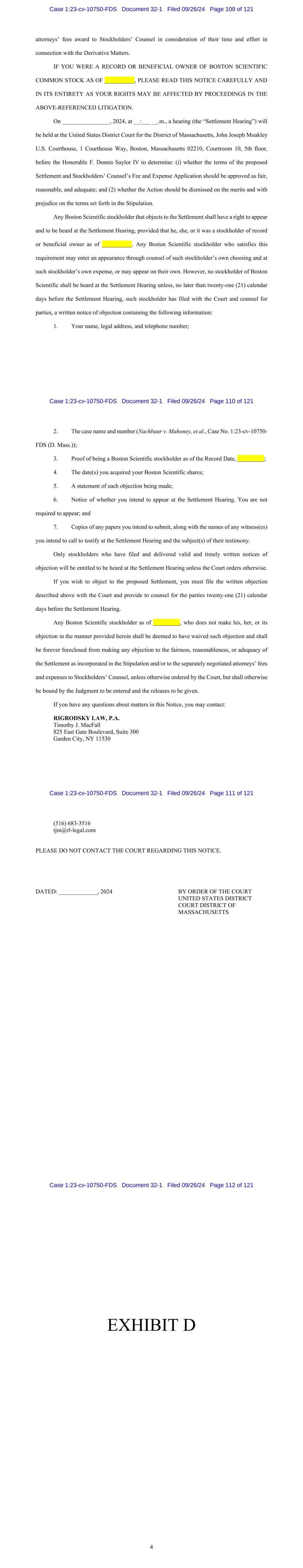 attorneys’ fees award to Stockholders’ Counsel in consideration of their time and effort in connection with the Derivative Matters. IF YOU WERE A RECORD OR BENEFICIAL OWNER OF BOSTON SCIENTIFIC COMMON STOCK AS OF __________, PLEASE READ THIS NOTICE CAREFULLY AND IN ITS ENTIRETY AS YOUR RIGHTS MAY BE AFFECTED BY PROCEEDINGS IN THE ABOVE-REFERENCED LITIGATION. On ________________, 2024, at __:___ __.m., a hearing (the “Settlement Hearing”) will be held at the United States District Court for the District of Massachusetts, John Joseph Moakley U.S. Courthouse, 1 Courthouse Way, Boston, Massachusetts 02210, Courtroom 10, 5th floor, before the Honorable F. Dennis Saylor IV to determine: (i) whether the terms of the proposed Settlement and Stockholders’ Counsel’s Fee and Expense Application should be approved as fair, reasonable, and adequate; and (2) whether the Action should be dismissed on the merits and with prejudice on the terms set forth in the Stipulation. Any Boston Scientific stockholder that objects to the Settlement shall have a right to appear and to be heard at the Settlement Hearing, provided that he, she, or it was a stockholder of record or beneficial owner as of __________. Any Boston Scientific stockholder who satisfies this requirement may enter an appearance through counsel of such stockholder’s own choosing and at such stockholder’s own expense, or may appear on their own. However, no stockholder of Boston Scientific shall be heard at the Settlement Hearing unless, no later than twenty-one (21) calendar days before the Settlement Hearing, such stockholder has filed with the Court and counsel for parties, a written notice of objection containing the following information: 1. Your name, legal address, and telephone number; Case 1:23-cv-10750-FDS Document 32-1 Filed 09/26/24 Page 109 of 121 2. The case name and number (Nachbaur v. Mahoney, et al., Case No. 1:23-cv-10750- FDS (D. Mass.)); 3. Proof of being a Boston Scientific stockholder as of the Record Date, _________; 4. The date(s) you acquired your Boston Scientific shares; 5. A statement of each objection being made; 6. Notice of whether you intend to appear at the Settlement Hearing. You are not required to appear; and 7. Copies of any papers you intend to submit, along with the names of any witness(es) you intend to call to testify at the Settlement Hearing and the subject(s) of their testimony. Only stockholders who have filed and delivered valid and timely written notices of objection will be entitled to be heard at the Settlement Hearing unless the Court orders otherwise. If you wish to object to the proposed Settlement, you must file the written objection described above with the Court and provide to counsel for the parties twenty-one (21) calendar days before the Settlement Hearing. Any Boston Scientific stockholder as of _________, who does not make his, her, or its objection in the manner provided herein shall be deemed to have waived such objection and shall be forever foreclosed from making any objection to the fairness, reasonableness, or adequacy of the Settlement as incorporated in the Stipulation and/or to the separately negotiated attorneys’ fees and expenses to Stockholders’ Counsel, unless otherwise ordered by the Court, but shall otherwise be bound by the Judgment to be entered and the releases to be given. If you have any questions about matters in this Notice, you may contact: RIGRODSKY LAW, P.A. Timothy J. MacFall 825 East Gate Boulevard, Suite 300 Garden City, NY 11530 Case 1:23-cv-10750-FDS Document 32-1 Filed 09/26/24 Page 110 of 121 (516) 683-3516 tjm@rl-legal.com PLEASE DO NOT CONTACT THE COURT REGARDING THIS NOTICE. DATED: , 2024 BY ORDER OF THE COURT UNITED STATES DISTRICT COURT DISTRICT OF MASSACHUSETTS 6) - 516 jm rl-l al. SE T TACT E URT RDING IS OTICE. TED: _____________ 24 ER F E URT I ED TES I RICT URT I ICT F ASSACHUSE TS Case 1:23-cv-10750-FDS Document 32-1 Filed 09/26/24 Page 111 of 121 EXHIBIT D 4 HIBIT Case 1:23-cv-10750-FDS Document 32-1 Filed 09/26/24 Page 112 of 121