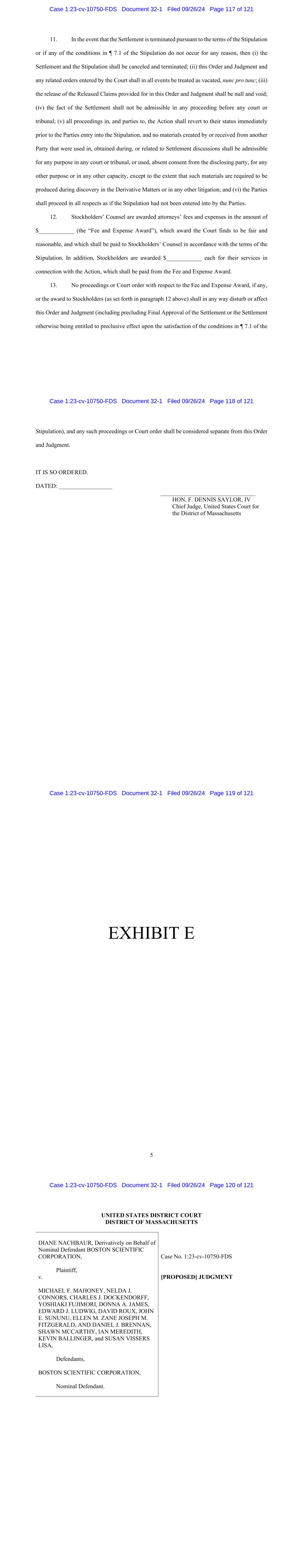 11. In the event that the Settlement is terminated pursuant to the terms of the Stipulation or if any of the conditions in ¶ 7.1 of the Stipulation do not occur for any reason, then (i) the Settlement and the Stipulation shall be canceled and terminated; (ii) this Order and Judgment and any related orders entered by the Court shall in all events be treated as vacated, nunc pro tunc; (iii) the release of the Released Claims provided for in this Order and Judgment shall be null and void; (iv) the fact of the Settlement shall not be admissible in any proceeding before any court or tribunal; (v) all proceedings in, and parties to, the Action shall revert to their status immediately prior to the Parties entry into the Stipulation, and no materials created by or received from another Party that were used in, obtained during, or related to Settlement discussions shall be admissible for any purpose in any court or tribunal, or used, absent consent from the disclosing party, for any other purpose or in any other capacity, except to the extent that such materials are required to be produced during discovery in the Derivative Matters or in any other litigation; and (vi) the Parties shall proceed in all respects as if the Stipulation had not been entered into by the Parties. 12. Stockholders’ Counsel are awarded attorneys’ fees and expenses in the amount of $____________ (the “Fee and Expense Award”), which award the Court finds to be fair and reasonable, and which shall be paid to Stockholders’ Counsel in accordance with the terms of the Stipulation. In addition, Stockholders are awarded $____________ each for their services in connection with the Action, which shall be paid from the Fee and Expense Award. 13. No proceedings or Court order with respect to the Fee and Expense Award, if any, or the award to Stockholders (as set forth in paragraph 12 above) shall in any way disturb or affect this Order and Judgment (including precluding Final Approval of the Settlement or the Settlement otherwise being entitled to preclusive effect upon the satisfaction of the conditions in ¶ 7.1 of the Case 1:23-cv-10750-FDS Document 32-1 Filed 09/26/24 Page 117 of 121 Stipulation), and any such proceedings or Court order shall be considered separate from this Order and Judgment. IT IS SO ORDERED. DATED: HON. F. DENNIS SAYLOR, IV Chief Judge, United States Court for the District of Massachusetts t ulation), d y h eedings r ourt r er a l e si ered arate is rder d ent. DERED. TED: __________________ ________________________________ N. . NIS LOR, hief ge, nited t tes ourt r e istrict f a sachuse t Case 1:23-cv-10750-FDS Document 32-1 Filed 09/26/24 Page 118 of 121 EXHIBIT E 5 HIBIT Case 1:23-cv-10750-FDS Document 32-1 Filed 09/26/24 Page 119 of 121 UNITED STATES DISTRICT COURT DISTRICT OF MASSACHUSETTS DIANE NACHBAUR, Derivatively on Behalf of Nominal Defendant BOSTON SCIENTIFIC CORPORATION, Plaintiff, v. MICHAEL F. MAHONEY, NELDA J. CONNORS, CHARLES J. DOCKENDORFF, YOSHIAKI FUJIMORI, DONNA A. JAMES, EDWARD J. LUDWIG, DAVID ROUX, JOHN E. SUNUNU, ELLEN M. ZANE JOSEPH M. FITZGERALD, AND DANIEL J. BRENNAN, SHAWN MCCARTHY, IAN MEREDITH, KEVIN BALLINGER, and SUSAN VISSERS LISA, Defendants, BOSTON SCIENTIFIC CORPORATION, Nominal Defendant. Case No. 1:23-cv-10750-FDS [PROPOSED] JUDGMENT Case 1:23-cv-10750-FDS Document 32-1 Filed 09/26/24 Page 120 of 121