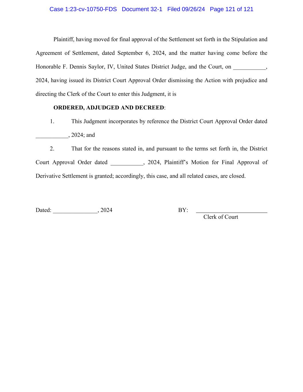 Plaintiff, having moved for final approval of the Settlement set forth in the Stipulation and Agreement of Settlement, dated September 6, 2024, and the matter having come before the Honorable F. Dennis Saylor, IV, United States District Judge, and the Court, on ___________, 2024, having issued its District Court Approval Order dismissing the Action with prejudice and directing the Clerk of the Court to enter this Judgment, it is ORDERED, ADJUDGED AND DECREED: 1. This Judgment incorporates by reference the District Court Approval Order dated ___________, 2024; and 2. That for the reasons stated in, and pursuant to the terms set forth in, the District Court Approval Order dated ___________, 2024, Plaintiff’s Motion for Final Approval of Derivative Settlement is granted; accordingly, this case, and all related cases, are closed. Dated: _______________, 2024 BY: Clerk of Court Case 1:23-cv-10750-FDS Document 32-1 Filed 09/26/24 Page 121 of 121