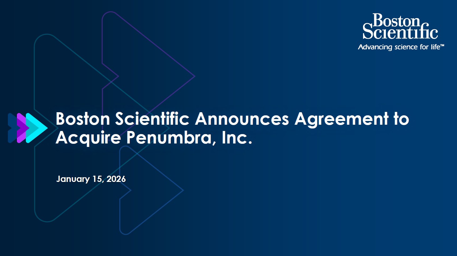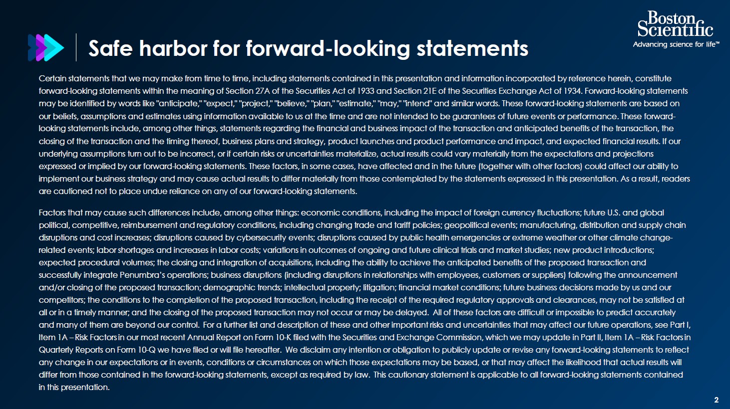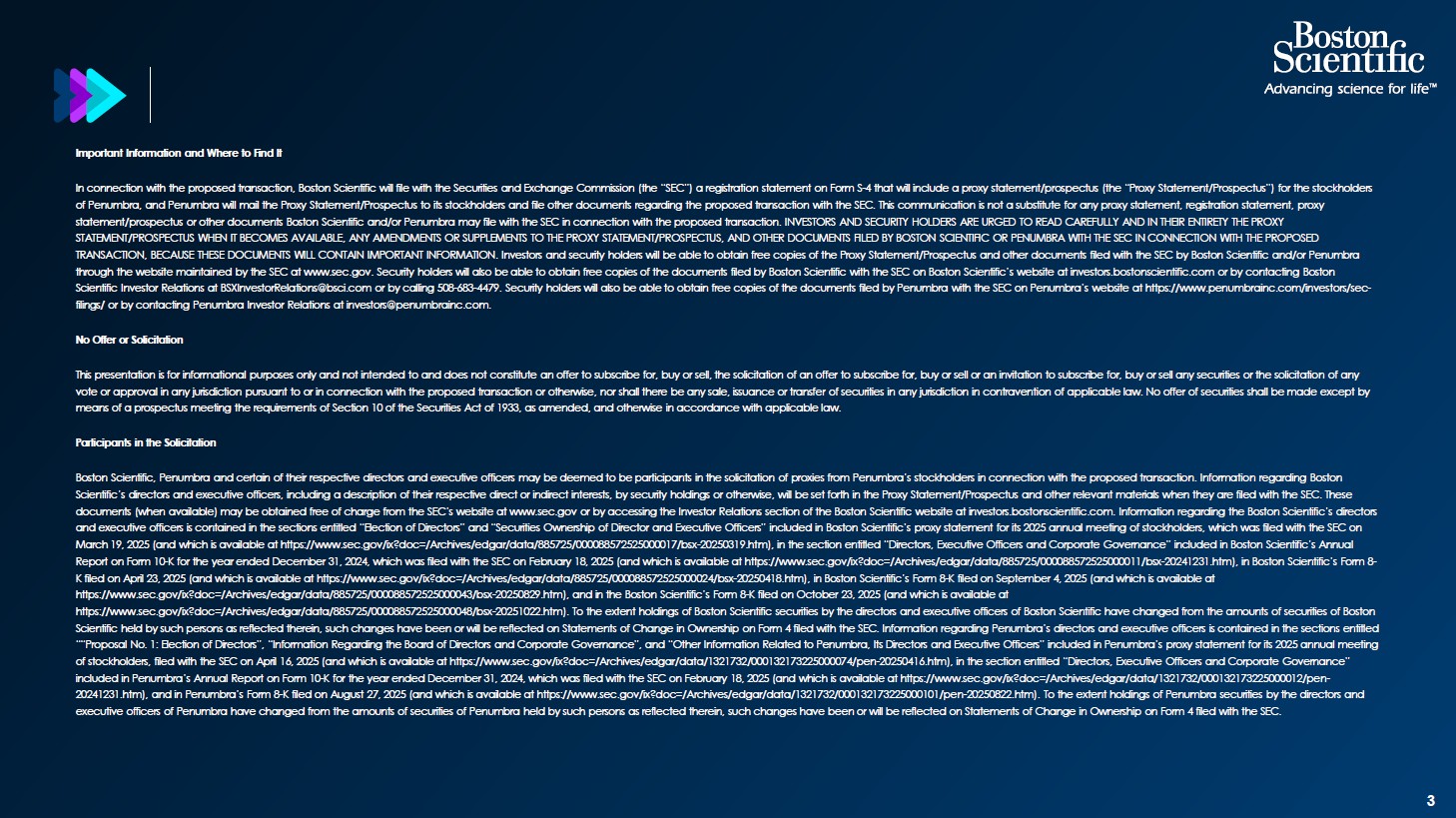 Boston Scientific Advancing science for life TM Important Information and Where to Find It In connection with the proposed transaction, Boston Scientific will file with the Securities and Exchange Commission (the “SEC”) a registration statement on Form S-4 that will include a proxy statement/prospectus (the “Proxy Statement/Prospectus”) for the stockholders of Penumbra, and Penumbra will mail the Proxy Statement/Prospectus to its stockholders and file other documents regarding the proposed transaction with the SEC. This communication is not a substitute for any proxy statement, registration statement, proxy statement/prospectus or other documents Boston Scientific and/or Penumbra may file with the SEC in connection with the proposed transaction. INVESTORS AND SECURITY HOLDERS ARE URGED TO READ CAREFULLY AND IN THEIR ENTIRETY THE PROXY STATEMENT/PROSPECTUS WHEN IT BECOMES AVAILABLE, ANY AMENDMENTS OR SUPPLEMENTS TO THE PROXY STATEMENT/PROSPECTUS, AND OTHER DOCUMENTS FILED BY BOSTON SCIENTIFIC OR PENUMBRA WITH THE SEC IN CONNECTION WITH THE PROPOSED TRANSACTION, BECAUSE THESE DOCUMENTS WILL CONTAIN IMPORTANT INFORMATION. Investors and security holders will be able to obtain free copies of the Proxy Statement/Prospectus and other documents filed with the SEC by Boston Scientific and/or Penumbra through the website maintained by the SEC at www.sec.gov. Security holders will also be able to obtain free copies of the documents filed by Boston Scientific with the SEC on Boston Scientific’s website at investors.bostonscientific.com or by contacting Boston Scientific Investor Relations at BSXInvestorRelations@bsci.com or by calling 508-683-4479. Security holders will also be able to obtain free copies of the documents filed by Penumbra with the SEC on Penumbra’s website at https://www.penumbrainc.com/investors/sec-filings/ or by contacting Penumbra Investor Relations at investors@penumbrainc.com. No Offer or Solicitation This presentation is for informational purposes only and not intended to and does not constitute an offer to subscribe for, buy or sell, the solicitation of an offer to subscribe for, buy or sell or an invitation to subscribe for, buy or sell any securities or the solicitation of any vote or approval in any jurisdiction pursuant to or in connection with the proposed transaction or otherwise, nor shall there be any sale, issuance or transfer of securities in any jurisdiction in contravention of applicable law. No offer of securities shall be made except by means of a prospectus meeting the requirements of Section 10 of the Securities Act of 1933, as amended, and otherwise in accordance with applicable law. Participants in the Solicitation Boston Scientific, Penumbra and certain of their respective directors and executive officers may be deemed to be participants in the solicitation of proxies from Penumbra’s stockholders in connection with the proposed transaction. Information regarding Boston Scientific’s directors and executive officers, including a description of their respective direct or indirect interests, by security holdings or otherwise, will be set forth in the Proxy Statement/Prospectus and other relevant materials when they are filed with the SEC. These documents (when available) may be obtained free of charge from the SEC’s website at www.sec.gov or by accessing the Investor Relations section of the Boston Scientific website at investors.bostonscientific.com. Information regarding the Boston Scientific’s directors and executive officers is contained in the sections entitled “Election of Directors” and “Securities Ownership of Director and Executive Officers” included in Boston Scientific’s proxy statement for its 2025 annual meeting of stockholders, which was filed with the SEC on March 19, 2025 (and which is available at https://www.sec.gov/ix?doc=/Archives/edgar/data/885725/000088572525000017/bsx-20250319.htm), in the section entitled “Directors, Executive Officers and Corporate Governance” included in Boston Scientific’s Annual Report on Form 10–K for the year ended December 31, 2024, which was filed with the SEC on February 18, 2025 (and which is available at https://www.sec.gov/ix?doc=/Archives/edgar/data/885725/000088572525000011/bsx-20241231.htm), in Boston Scientific’s Form 8–K filed on April 23, 2025 (and which is available at https://www.sec.gov/ix?doc=/Archives/edgar/data/885725/000088572525000024/bsx-20250418.htm), in Boston Scientific’s Form 8–K filed on September 4, 2025 (and which is available at https://www.sec.gov/ix?doc=/Archives/edgar/data/885725/000088572525000043/bsx-20250829.htm), and in the Boston Scientific’s Form 8–K filed on October 23, 2025 (and which is available at https://www.sec.gov/ix?doc=/Archives/edgar/data/885725/000088572525000048/bsx-20251022.htm). To the extent holdings of Boston Scientific securities by the directors and executive officers of Boston Scientific have changed from the amounts of securities of Boston Scientific held by such persons as reflected therein, such changes have been or will be reflected on Statements of Change in Ownership on Form 4 filed with the SEC. Information regarding Penumbra’s directors and executive officers is contained in the sections entitled ““Proposal No. 1: Election of Directors”, “Information Regarding the Board of Directors and Corporate Governance”, and “Other Information Related to Penumbra, Its Directors and Executive Officers” included in Penumbra’s proxy statement for its 2025 annual meeting of stockholders, filed with the SEC on April 16, 2025 (and which is available at https://www.sec.gov/ix?doc=/Archives/edgar/data/1321732/000132173225000074/pen-20250416.htm), in the section entitled “Directors, Executive Officers and Corporate Governance” included in Penumbra’s Annual Report on Form 10–K for the year ended December 31, 2024, which was filed with the SEC on February 18, 2025 (and which is available at https: