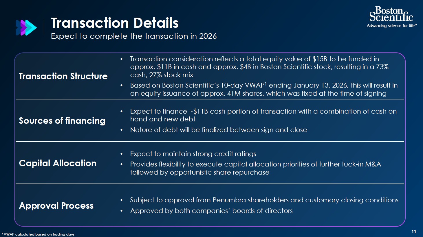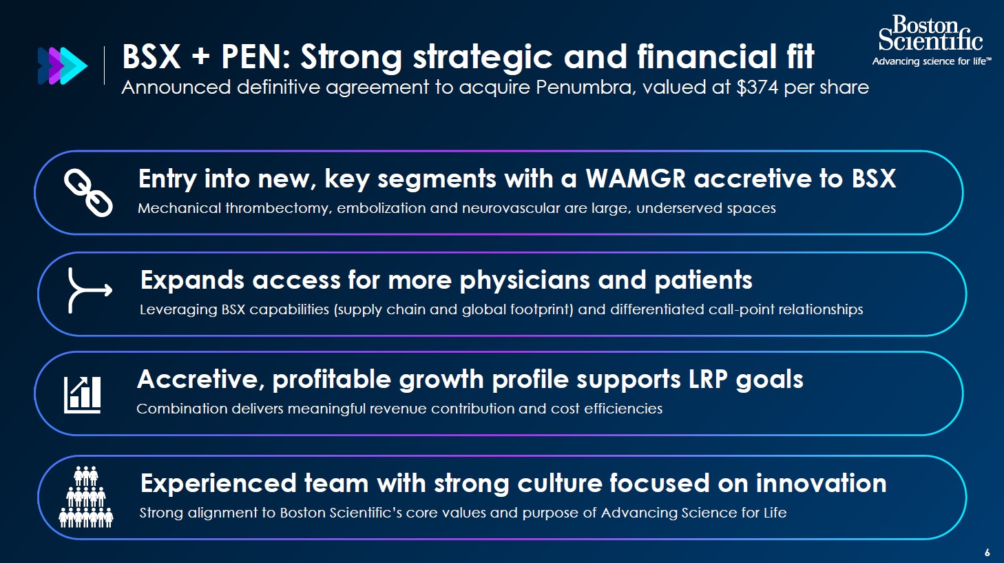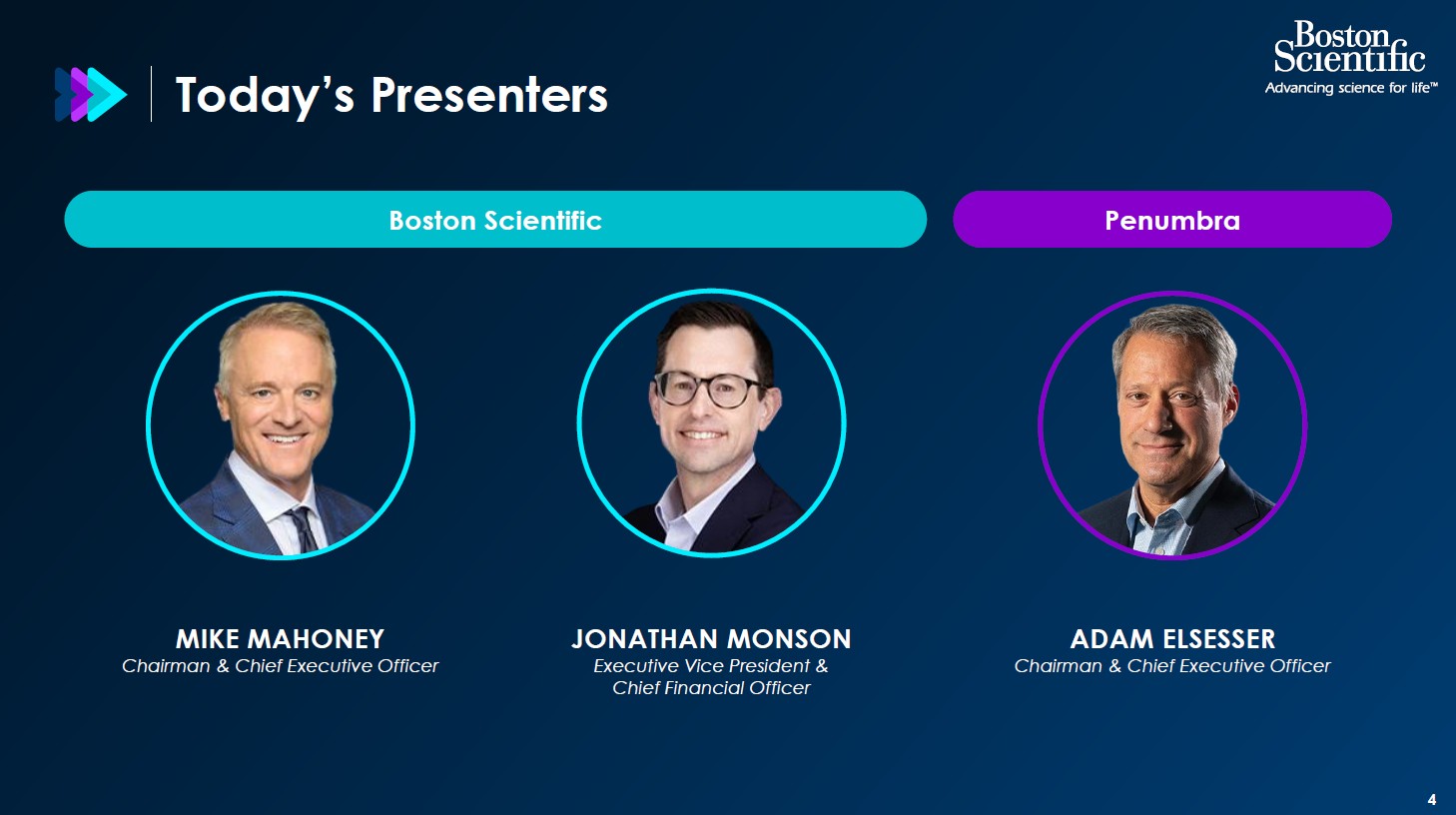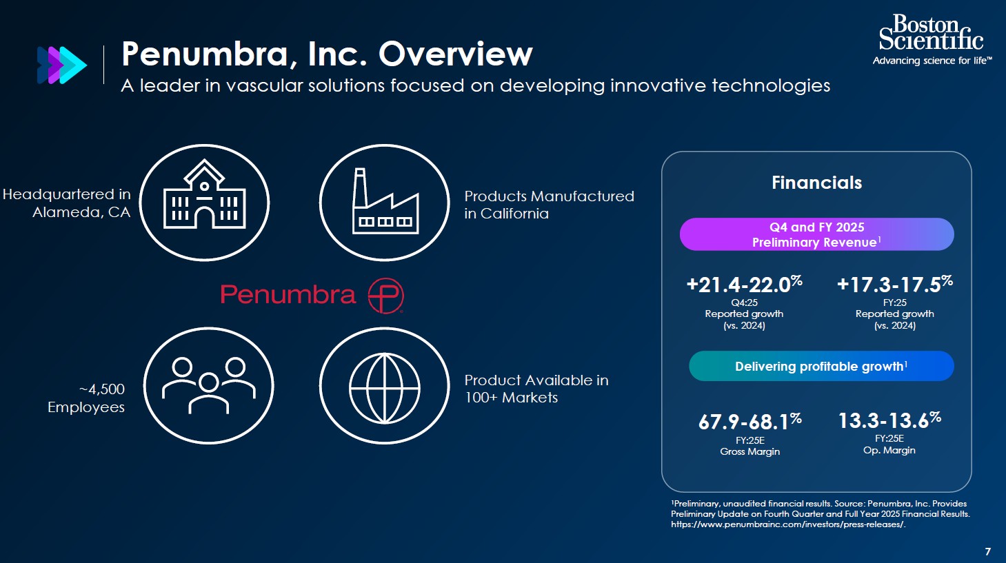 Boston Scientific Advancing science for life TM Important Information and Where to Find It In connection with the proposed transaction, Boston Scientific will file with the Securities and Exchange Commission (the “SEC”) a registration statement on Form S-4 that will include a proxy statement/prospectus (the “Proxy Statement/Prospectus”) for the stockholders of Penumbra, and Penumbra will mail the Proxy Statement/Prospectus to its stockholders and file other documents regarding the proposed transaction with the SEC. This communication is not a substitute for any proxy statement, registration statement, proxy statement/prospectus or other documents Boston Scientific and/or Penumbra may file with the SEC in connection with the proposed transaction. INVESTORS AND SECURITY HOLDERS ARE URGED TO READ CAREFULLY AND IN THEIR ENTIRETY THE PROXY STATEMENT/PROSPECTUS WHEN IT BECOMES AVAILABLE, ANY AMENDMENTS OR SUPPLEMENTS TO THE PROXY STATEMENT/PROSPECTUS, AND OTHER DOCUMENTS FILED BY BOSTON SCIENTIFIC OR PENUMBRA WITH THE SEC IN CONNECTION WITH THE PROPOSED TRANSACTION, BECAUSE THESE DOCUMENTS WILL CONTAIN IMPORTANT INFORMATION. Investors and security holders will be able to obtain free copies of the Proxy Statement/Prospectus and other documents filed with the SEC by Boston Scientific and/or Penumbra through the website maintained by the SEC at www.sec.gov. Security holders will also be able to obtain free copies of the documents filed by Boston Scientific with the SEC on Boston Scientific’s website at investors.bostonscientific.com or by contacting Boston Scientific Investor Relations at BSXInvestorRelations@bsci.com or by calling 508-683-4479. Security holders will also be able to obtain free copies of the documents filed by Penumbra with the SEC on Penumbra’s website at https://www.penumbrainc.com/investors/sec-filings/ or by contacting Penumbra Investor Relations at investors@penumbrainc.com. No Offer or Solicitation This presentation is for informational purposes only and not intended to and does not constitute an offer to subscribe for, buy or sell, the solicitation of an offer to subscribe for, buy or sell or an invitation to subscribe for, buy or sell any securities or the solicitation of any vote or approval in any jurisdiction pursuant to or in connection with the proposed transaction or otherwise, nor shall there be any sale, issuance or transfer of securities in any jurisdiction in contravention of applicable law. No offer of securities shall be made except by means of a prospectus meeting the requirements of Section 10 of the Securities Act of 1933, as amended, and otherwise in accordance with applicable law. Participants in the Solicitation Boston Scientific, Penumbra and certain of their respective directors and executive officers may be deemed to be participants in the solicitation of proxies from Penumbra’s stockholders in connection with the proposed transaction. Information regarding Boston Scientific’s directors and executive officers, including a description of their respective direct or indirect interests, by security holdings or otherwise, will be set forth in the Proxy Statement/Prospectus and other relevant materials when they are filed with the SEC. These documents (when available) may be obtained free of charge from the SEC’s website at www.sec.gov or by accessing the Investor Relations section of the Boston Scientific website at investors.bostonscientific.com. Information regarding the Boston Scientific’s directors and executive officers is contained in the sections entitled “Election of Directors” and “Securities Ownership of Director and Executive Officers” included in Boston Scientific’s proxy statement for its 2025 annual meeting of stockholders, which was filed with the SEC on March 19, 2025 (and which is available at https://www.sec.gov/ix?doc=/Archives/edgar/data/885725/000088572525000017/bsx-20250319.htm), in the section entitled “Directors, Executive Officers and Corporate Governance” included in Boston Scientific’s Annual Report on Form 10–K for the year ended December 31, 2024, which was filed with the SEC on February 18, 2025 (and which is available at https://www.sec.gov/ix?doc=/Archives/edgar/data/885725/000088572525000011/bsx-20241231.htm), in Boston Scientific’s Form 8–K filed on April 23, 2025 (and which is available at https://www.sec.gov/ix?doc=/Archives/edgar/data/885725/000088572525000024/bsx-20250418.htm), in Boston Scientific’s Form 8–K filed on September 4, 2025 (and which is available at https://www.sec.gov/ix?doc=/Archives/edgar/data/885725/000088572525000043/bsx-20250829.htm), and in the Boston Scientific’s Form 8–K filed on October 23, 2025 (and which is available at https://www.sec.gov/ix?doc=/Archives/edgar/data/885725/000088572525000048/bsx-20251022.htm). To the extent holdings of Boston Scientific securities by the directors and executive officers of Boston Scientific have changed from the amounts of securities of Boston Scientific held by such persons as reflected therein, such changes have been or will be reflected on Statements of Change in Ownership on Form 4 filed with the SEC. Information regarding Penumbra’s directors and executive officers is contained in the sections entitled ““Proposal No. 1: Election of Directors”, “Information Regarding the Board of Directors and Corporate Governance”, and “Other Information Related to Penumbra, Its Directors and Executive Officers” included in Penumbra’s proxy statement for its 2025 annual meeting of stockholders, filed with the SEC on April 16, 2025 (and which is available at https://www.sec.gov/ix?doc=/Archives/edgar/data/1321732/000132173225000074/pen-20250416.htm), in the section entitled “Directors, Executive Officers and Corporate Governance” included in Penumbra’s Annual Report on Form 10–K for the year ended December 31, 2024, which was filed with the SEC on February 18, 2025 (and which is available at https: