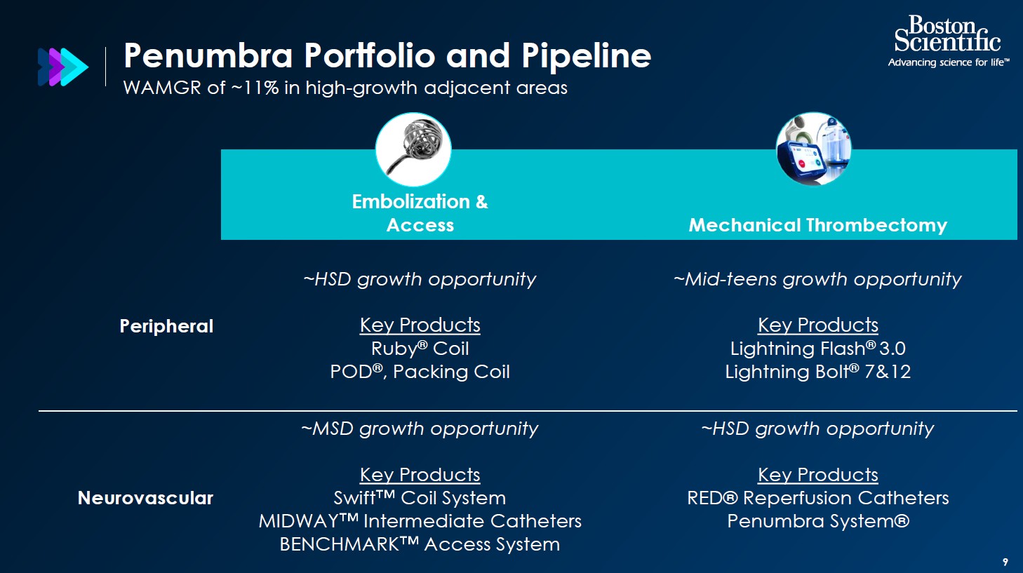 Boston Scientific Advancing science for life TM Penumbra Portfolio and Pipeline WAMGR of 11% in high-growth adjacent areas Embolization & Access Mechanical Thrombectomy Peripheral Neurovascular ~HSD growth opportunity Key Products Ruby Coil POD, Packing Coil ~Mid-teens growth opportunity Key Products Lightning Flash 3.0 Lightning Bolt 7&12 ~MSD growth opportunity Key Products Swift Coil System MIDWAY Intermediate Catheters BENCHMARKTM Access System ~HSD growth opportunity Key Products RED Reperfusion Catheters Penumbra System 9