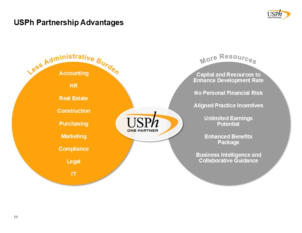 More Resources  Less Administrative Burden  USPh Partnership Advantages  11  Accounting  HR  Real Estate  Construction  Purchasing  Marketing  Compliance  Legal  IT  Capital and Resources to Enhance Development Rate  No Personal Financial Risk  Aligned Practice Incentives  Unlimited Earnings Potential   Enhanced Benefits Package  Business Intelligence and Collaborative Guidance
