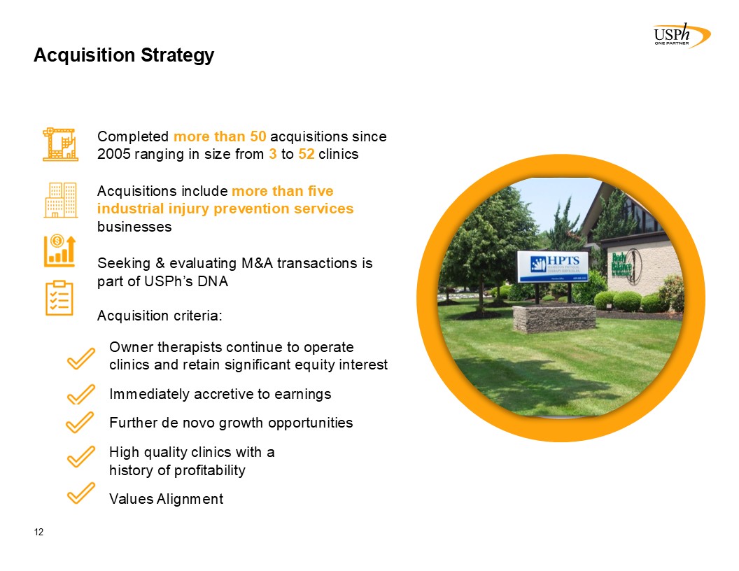 Highly Retentive, Partnership Model  10  Specialize in trauma, sports, work-related and pre- and post-surgical cases  Partner with experienced physical therapists   Drive volume via referrals  Augment sales with marketing reps   Organic growth includes lower cost de novo start up clinics  Strategic acquisitions structured as partnerships to create strong alignment of interests:  Significant ownership retained by founders (~20% to 40%)  Maintain established local brand  Monthly distributions of cash generated based on ownership percentages  Agree to purchase remaining interest of partners on back end at typically the same EBITDA multiple as the original purchase