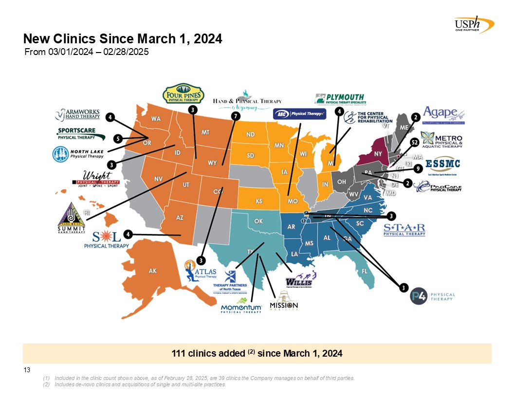 New Clinics Since March 1, 2024  13  111 clinics added (2) since March 1, 2024  From 03/01/2024 – 02/28/2025  WV  VT  VA  SC  PA  OH  NJ  NC  ME  MD  MA  GA  FL  CT  TX  OK  MS  LA  AR  AL  AK  TN  5  Included in the clinic count shown above, as of February 28, 2025, are 39 clinics the Company manages on behalf of third parties.   Includes de-novo clinics and acquisitions of single and multi-site practices.