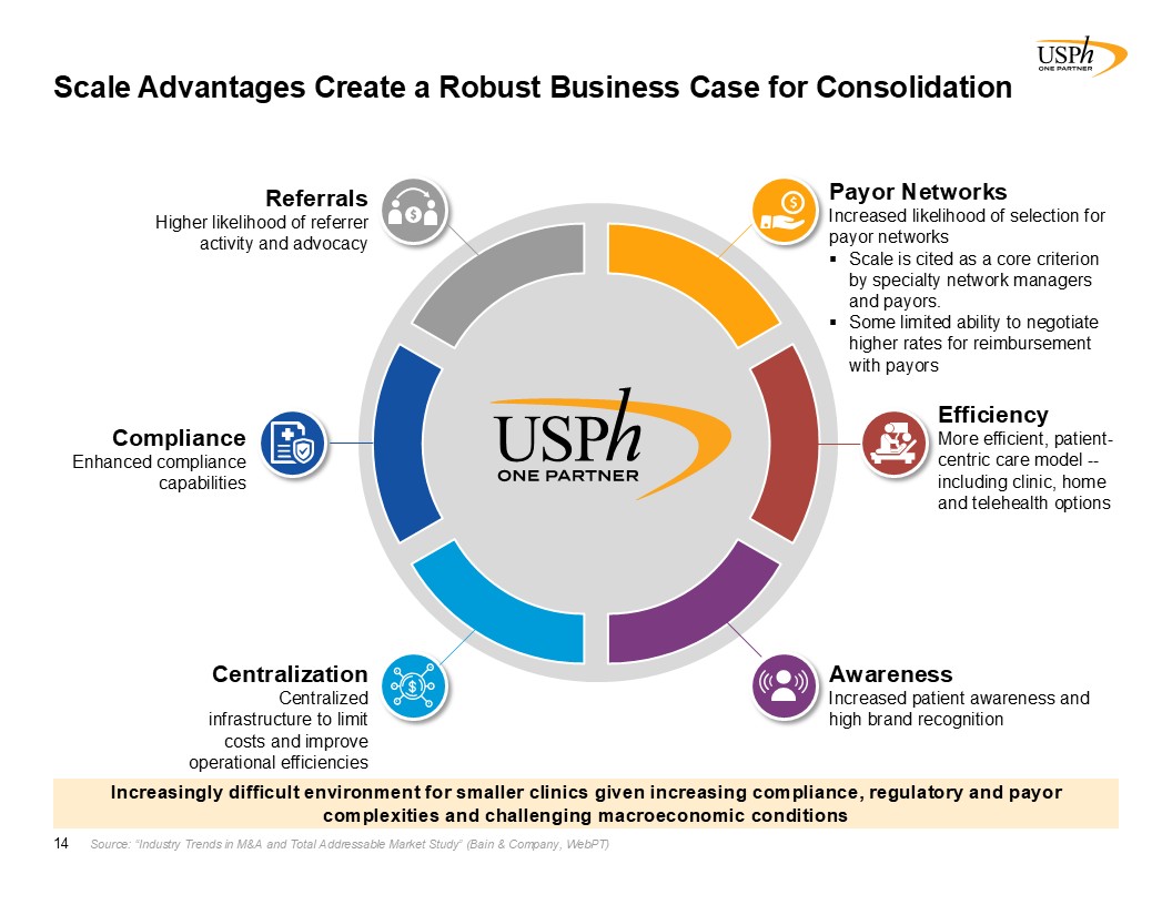 Scale Advantages Create a Robust Business Case for Consolidation  14  Increased likelihood of selection for payor networks  Scale is cited as a core criterion by specialty network managers and payors.  Some limited leverage in negotiations with payors for reimbursement  Higher likelihood of referrer activity and advocacy  More efficient, patient-centric care model -- including clinic, home and telehealth options  Enhanced compliance capabilities  Centralized infrastructure to limit costs and improve operational efficiencies  Increased patient awareness and high brand recognition  Source: “Industry Trends in M&A and Total Addressable Market Study” (Bain & Company, WebPT)  Efficiency  More efficient, patient-centric care model -- including clinic, home and telehealth options  Compliance  Enhanced compliance capabilities  Payor Networks  Increased likelihood of selection for payor networks  Scale is cited as a core criterion by specialty network managers and payors.  Some limited ability to negotiate higher rates for reimbursement with payors  Referrals  Higher likelihood of referrer activity and advocacy  Centralization  Centralized infrastructure to limit costs and improve operational efficiencies  Awareness  Increased patient awareness and high brand recognition  Increasingly difficult environment for smaller clinics given increasing compliance, regulatory and payor complexities and challenging macroeconomic conditions