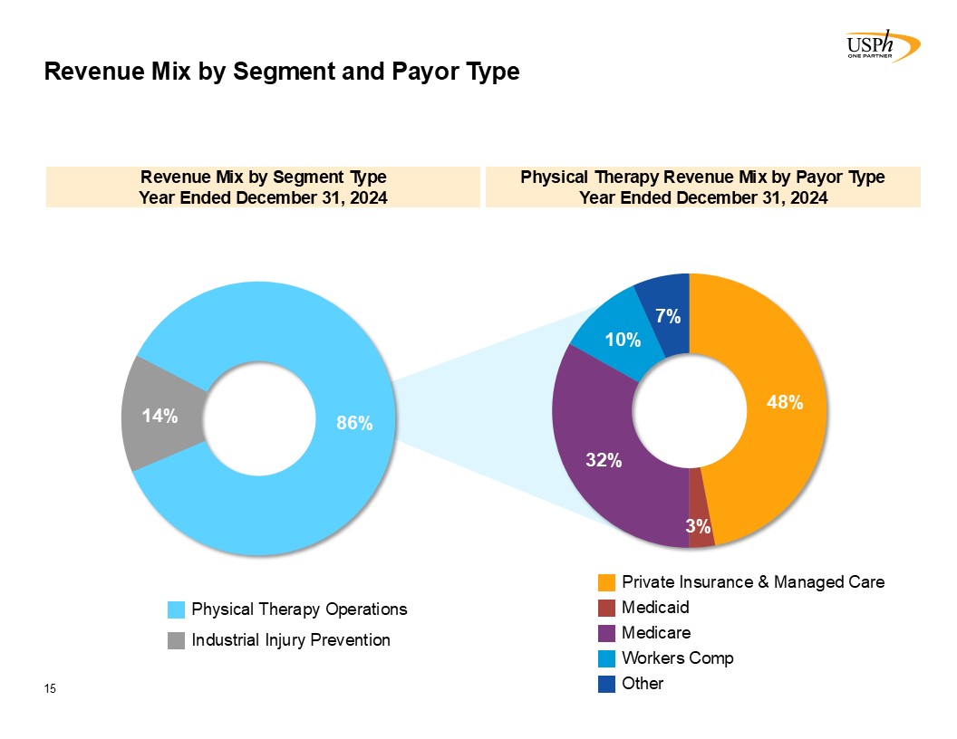 Revenue Mix by Segment and Payor Type  15  Physical Therapy Revenue Mix by Payor Type   Year Ended December 31, 2024  Other  Workers Comp  Private Insurance & Managed Care  Medicaid  Medicare  Revenue Mix by Segment Type  Year Ended December 31, 2024  Physical Therapy Operations  Industrial Injury Prevention