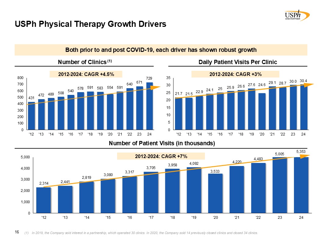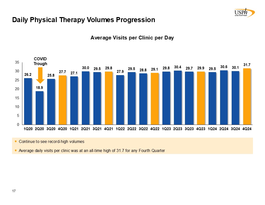 USPh Physical Therapy Growth Drivers  16  In 2019, the Company sold interest in a partnership, which operated 30 clinics. In 2020, the Company sold 14 previously closed clinics and closed 34 clinics.   Number of Clinics (1)  Daily Patient Visits Per Clinic   Number of Patient Visits (in thousands)  Both prior to and post COVID-19, each driver has shown robust growth  2012-2024: CAGR +4.5%  2012-2024: CAGR +3%  2012-2024: CAGR +7%  5,005  5,353