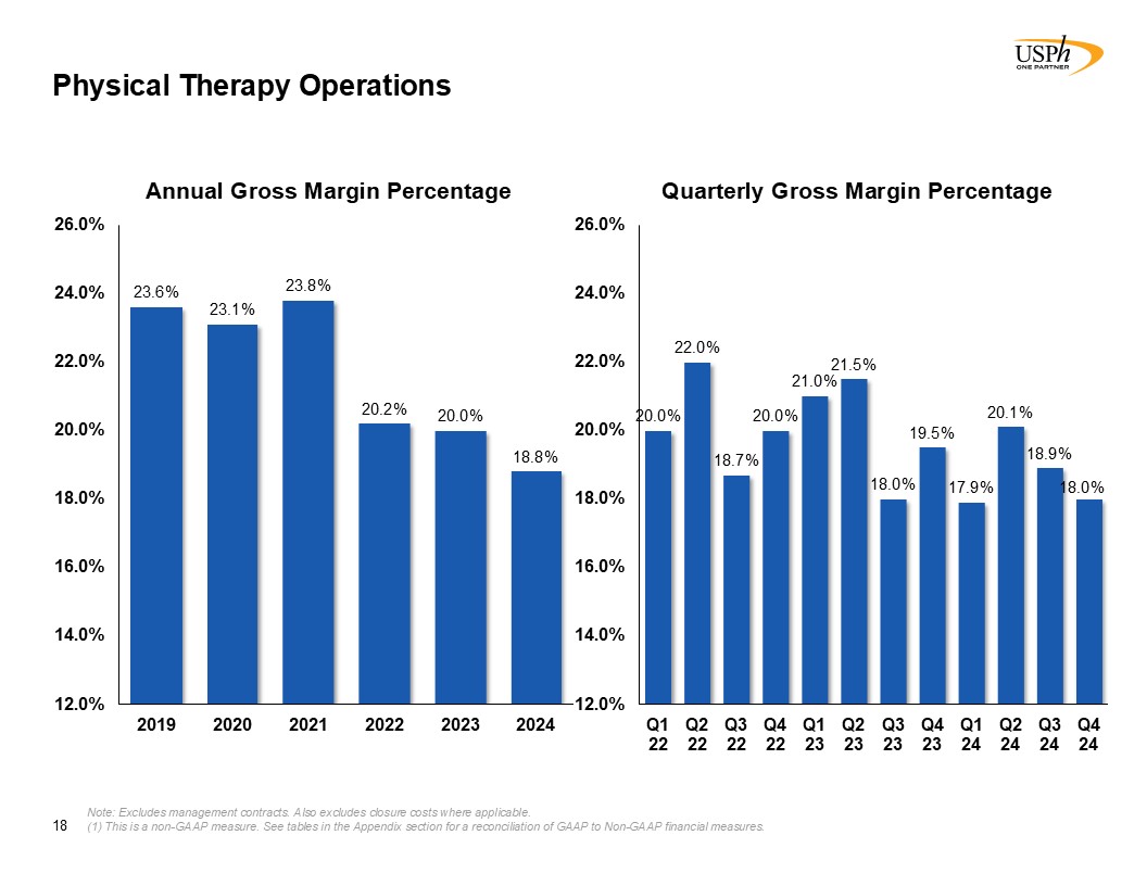 Physical Therapy Operations  18  Note: Excludes management contracts. Also excludes closure costs where applicable.  (1) This is a non-GAAP measure. See tables in the Appendix section for a reconciliation of GAAP to Non-GAAP financial measures.  Annual Gross Margin Percentage  Quarterly Gross Margin Percentage