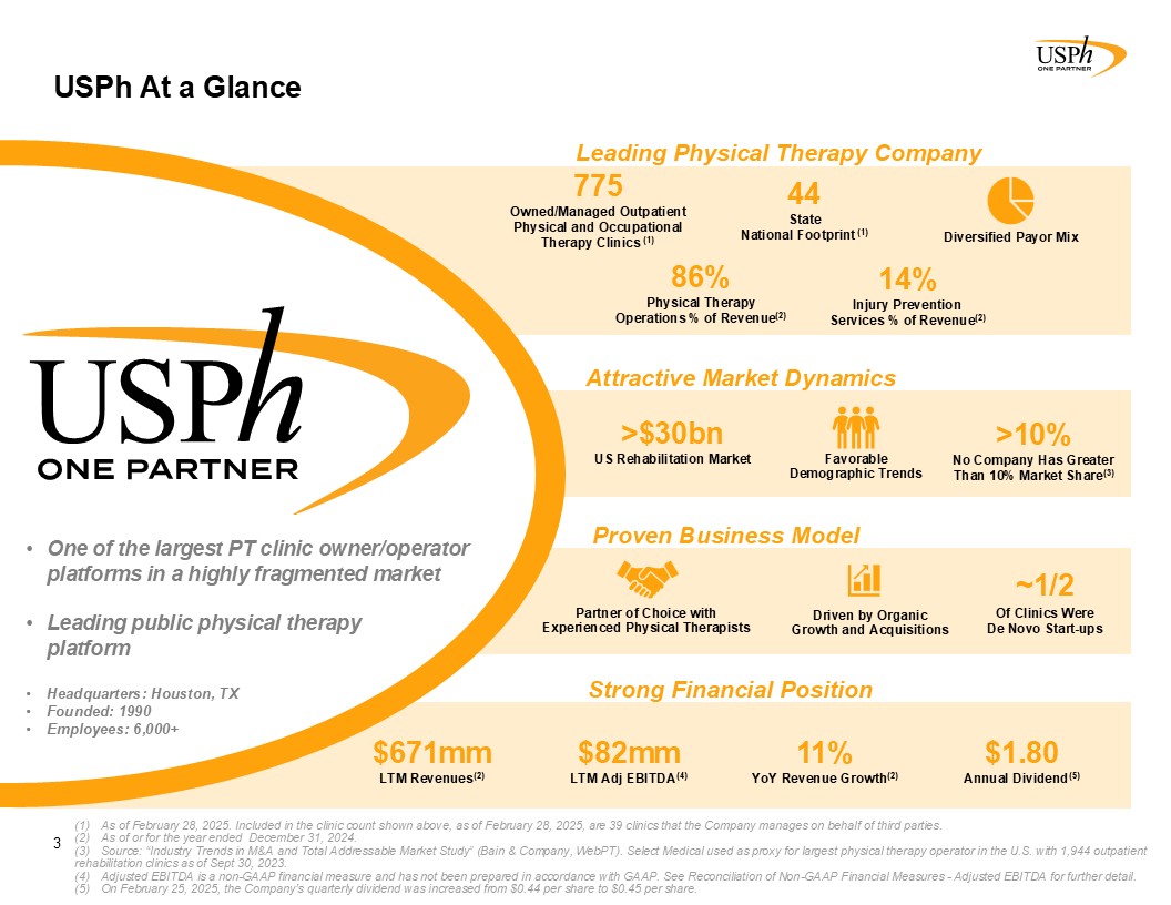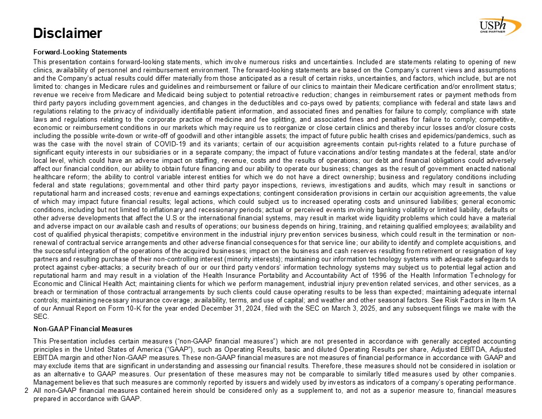 Disclaimer  2  Forward-Looking Statements   This presentation contains forward-looking statements, which involve numerous risks and uncertainties. Included are statements relating to opening of new clinics, availability of personnel and reimbursement environment. The forward-looking statements are based on the Company’s current views and assumptions and the Company’s actual results could differ materially from those anticipated as a result of certain risks, uncertainties, and factors, which include, but are not limited to: changes in Medicare rules and guidelines and reimbursement or failure of our clinics to maintain their Medicare certification and/or enrollment status; revenue we receive from Medicare and Medicaid being subject to potential retroactive reduction; changes in reimbursement rates or payment methods from third party payors including government agencies, and changes in the deductibles and co-pays owed by patients; compliance with federal and state laws and regulations relating to the privacy of individually identifiable patient information, and associated fines and penalties for failure to comply; compliance with state laws and regulations relating to the corporate practice of medicine and fee splitting, and associated fines and penalties for failure to comply; competitive, economic or reimbursement conditions in our markets which may require us to reorganize or close certain clinics and thereby incur losses and/or closure costs including the possible write-down or write-off of goodwill and other intangible assets; the impact of future public health crises and epidemics/pandemics, such as was the case with the novel strain of COVID-19 and its variants; certain of our acquisition agreements contain put-rights related to a future purchase of significant equity interests in our subsidiaries or in a separate company; the impact of future vaccinations and/or testing mandates at the federal, state and/or local level, which could have an adverse impact on staffing, revenue, costs and the results of operations; our debt and financial obligations could adversely affect our financial condition, our ability to obtain future financing and our ability to operate our business; changes as the result of government enacted national healthcare reform; the ability to control variable interest entities for which we do not have a direct ownership; business and regulatory conditions including federal and state regulations; governmental and other third party payor inspections, reviews, investigations and audits, which may result in sanctions or reputational harm and increased costs; revenue and earnings expectations; contingent consideration provisions in certain our acquisition agreements, the value of which may impact future financial results; legal actions, which could subject us to increased operating costs and uninsured liabilities; general economic conditions, including but not limited to inflationary and recessionary periods; actual or perceived events involving banking volatility or limited liability, defaults or other adverse developments that affect the U.S or the international financial systems, may result in market wide liquidity problems which could have a material and adverse impact on our available cash and results of operations; our business depends on hiring, training, and retaining qualified employees; availability and cost of qualified physical therapists; competitive environment in the industrial injury prevention services business, which could result in the termination or non-renewal of contractual service arrangements and other adverse financial consequences for that service line; our ability to identify and complete acquisitions, and the successful integration of the operations of the acquired businesses; impact on the business and cash reserves resulting from retirement or resignation of key partners and resulting purchase of their non-controlling interest (minority interests); maintaining our information technology systems with adequate safeguards to protect against cyber-attacks; a security breach of our or our third party vendors’ information technology systems may subject us to potential legal action and reputational harm and may result in a violation of the Health Insurance Portability and Accountability Act of 1996 of the Health Information Technology for Economic and Clinical Health Act; maintaining clients for which we perform management, industrial injury prevention related services, and other services, as a breach or termination of those contractual arrangements by such clients could cause operating results to be less than expected; maintaining adequate internal controls; maintaining necessary insurance coverage; availability, terms, and use of capital; and weather and other seasonal factors. See Risk Factors in Item 1A of our Annual Report on Form 10-K for the year ended December 31, 2024, filed with the SEC on March 3, 2025, and any subsequent filings we make with the SEC.  Non-GAAP Financial Measures  This Presentation includes certain measures (“non-GAAP financial measures”) which are not presented in accordance with generally accepted accounting principles in the United States of America (“GAAP”), such as Operating Results, basic and diluted Operating Results per share, Adjusted EBITDA, Adjusted EBITDA margin and other Non-GAAP measures. These non-GAAP financial measures are not measures of financial performance in accordance with GAAP and may exclude items that are significant in understanding and assessing our financial results. Therefore, these measures should not be considered in isolation or as an alternative to GAAP measures. Our presentation of these measures may not be comparable to similarly titled measures used by other companies. Management believes that such measures are commonly reported by issuers and widely used by investors as indicators of a company’s operating performance. All non-GAAP financial measures contained