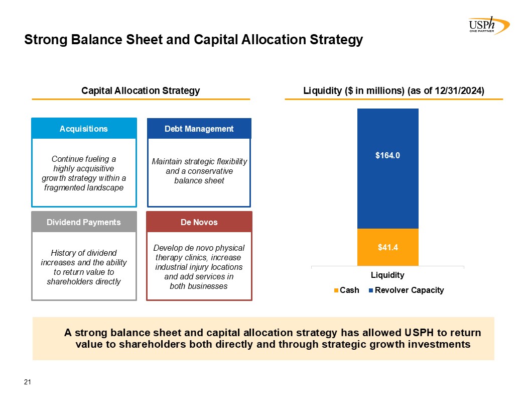 Strong Balance Sheet and Capital Allocation Strategy  21  At June 30, 2024, we had $112.9 million in cash and $142.5 million outstanding on our term loan. We have $175 million available for borrowings under our revolving facility.  A strong balance sheet and capital allocation strategy has allowed USPH to return value to shareholders both directly and through strategic growth investments  In 2023, the Company generated Adjusted EBITDA(1) of $77.7 million  Liquidity ($ in millions) (as of 06/30/24)  Acquisitions  Continue fueling a highly acquisitive growth strategy within a fragmented landscape  Maintain strategic flexibility and a conservative balance sheet   Debt Management  Capital Allocation Strategy  History of dividend increases and the ability to return value to shareholders directly   Dividend Issuances  Debt Management  Minimize interest expense and maintain strategic flexibility  Liquidity ($ in millions) (as of 12/31/2024)  Dividend Payments  History of dividend increases and the ability to return value to shareholders directly   De Novos  Develop de novo physical therapy clinics, increase industrial injury locations and add services in   both businesses