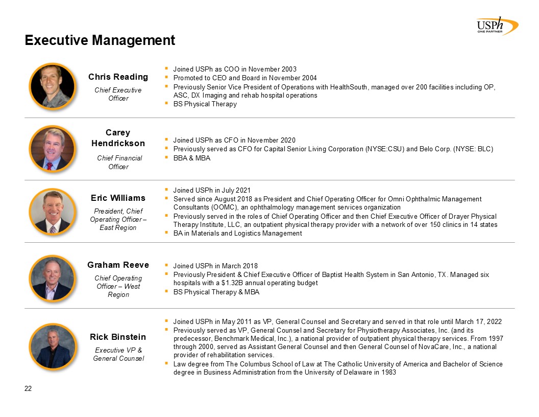 Executive Management  22  https://www.usph.com/about/senior-leadership/  https://www.linkedin.com/in/rick-binstein-66944512  Joined USPh as CFO in November 2020  Previously served as CFO for Capital Senior Living Corporation (NYSE:CSU) and Belo Corp. (NYSE: BLC)  BBA & MBA  Carey Hendrickson   Chief Financial Officer  Joined USPh in March 2018  Previously President & Chief Executive Officer of Baptist Health System in San Antonio, TX. Managed six hospitals with a $1.32B annual operating budget  BS Physical Therapy & MBA  Graham Reeve   Chief Operating Officer – West Region  Joined USPh in July 2021  Served since August 2018 as President and Chief Operating Officer for Omni Ophthalmic Management Consultants (OOMC), an ophthalmology management services organization  Previously served in the roles of Chief Operating Officer and then Chief Executive Officer of Drayer Physical Therapy Institute, LLC, an outpatient physical therapy provider with a network of over 150 clinics in 14 states  BA in Materials and Logistics Management  Eric Williams   President, Chief Operating Officer – East Region  Joined USPh in May 2011 as VP, General Counsel and Secretary and served in that role until March 17, 2022   Previously served as VP, General Counsel and Secretary for Physiotherapy Associates, Inc. (and its predecessor, Benchmark Medical, Inc.), a national provider of outpatient physical therapy services. From 1997 through 2000, served as Assistant General Counsel and then General Counsel of NovaCare, Inc., a national provider of rehabilitation services.   Law degree from The Columbus School of Law at The Catholic University of America and Bachelor of Science degree in Business Administration from the University of Delaware in 1983  Rick Binstein   Executive VP & General Counsel  Joined USPh as COO in November 2003  Promoted to CEO and Board in November 2004  Previously Senior Vice President of Operations with HealthSouth, managed over 200 facilities including OP, ASC, DX Imaging and rehab hospital operations  BS Physical Therapy  Chris Reading  Chief Executive Officer