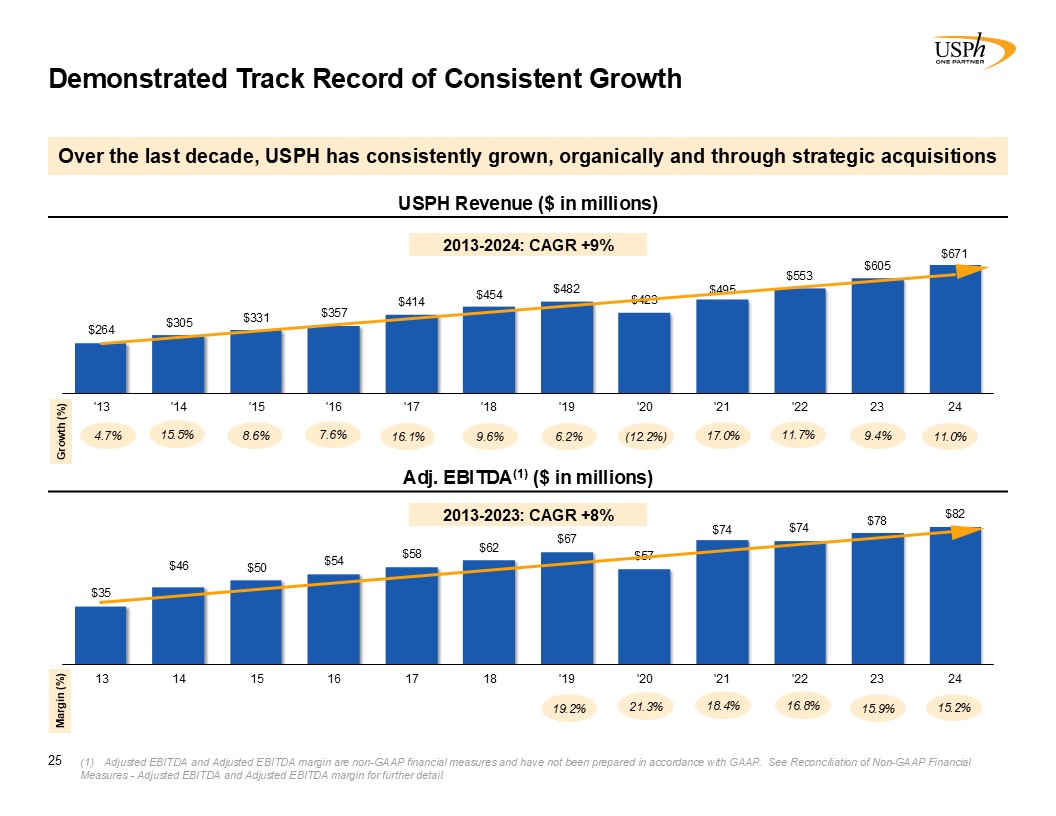Transaction Overview  Demonstrated Track Record of Consistent Growth  Over the last decade, USPH has consistently grown, organically and through strategic acquisitions  USPH Revenue ($ in millions)  Adj. EBITDA(1) ($ in millions)  4.7%  15.5%  8.6%  7.6%  16.1%  9.6%  6.2%  (12.2%)  17.0%  11.7%  19.2%  21.3%  18.4%  16.8%  25  Growth (%)  Margin (%)  2013-2023: CAGR +8%  2013-2024: CAGR +9%  Adjusted EBITDA and Adjusted EBITDA margin are non-GAAP financial measures and have not been prepared in accordance with GAAP. See Reconciliation of Non-GAAP Financial Measures - Adjusted EBITDA and Adjusted EBITDA margin for further detail.  9.4%  15.9%  11.0%  15.2%