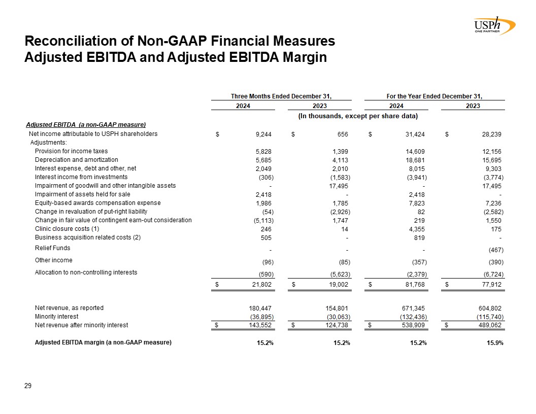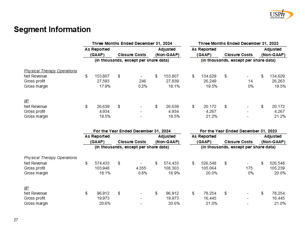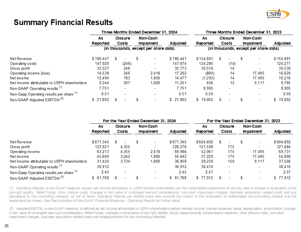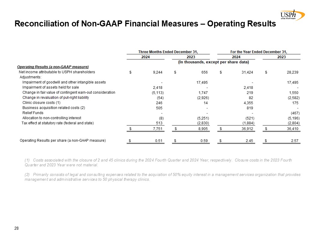 Summary Financial Results  26  Operating Results, a non-GAAP measure, equals net income attributable to USPH diluted shareholders per the consolidated statements of income, less a change in revaluation of the put-right liability, Relief Funds, clinic closure costs, changes in fair value of contingent earnout consideration, non-cash impairment charges, business acquisition related costs and any allocations to non-controlling interests, all net of taxes. Operating Results per diluted share also exclude the impact of the revaluation of redeemable non-controlling interest and the associated tax impact. See Reconciliation of Non-GAAP Financial Measures - Operating Results for further detail.  Adjusted EBITDA, a non-GAAP measure, is defined as net income attributable to USPH shareholders before interest income, interest expense, taxes, depreciation, amortization, change in fair value of contingent earn-out consideration, Relief Funds, changes in revaluation of put-right liability, equity-based awards compensation expense, clinic closure costs, non-cash impairment charges, business acquisition related costs and related portions for non-controlling interests.