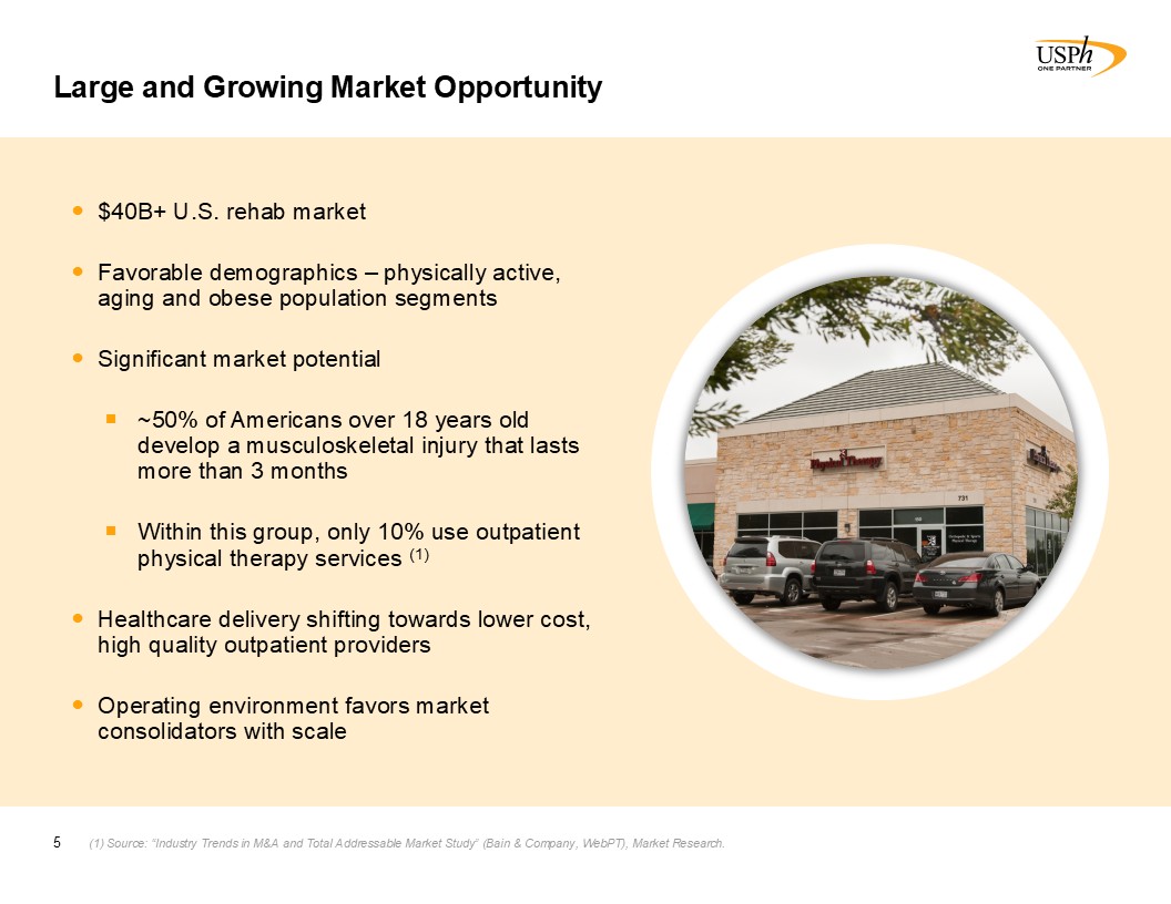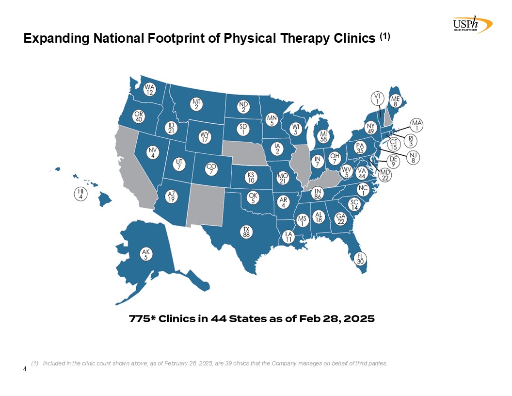 775  Owned/Managed Outpatient Physical and Occupational Therapy Clinics (1)  44  State   National Footprint (1)  86%  Physical Therapy   Operations % of Revenue(2)  14%  Injury Prevention   Services % of Revenue(2)  >$30bn  US Rehabilitation Market  >10%  No Company Has Greater Than 10% Market Share(3)  Partner of Choice with Experienced Physical Therapists  ~1/2  Of Clinics Were   De Novo Start-ups  $671mm  LTM Revenues(2)  $82mm  LTM Adj EBITDA(4)  11%  YoY Revenue Growth(2)  $1.80  Annual Dividend(5)  Proven Business Model  Attractive Market Dynamics  Leading Physical Therapy Company  USPh At a Glance  3  Strong Financial Position  One of the largest PT clinic owner/operator platforms in a highly fragmented market   Leading public physical therapy platform  Headquarters: Houston, TX  Founded: 1990  Employees: 6,000+  Favorable Demographic Trends  As of February 28, 2025. Included in the clinic count shown above, as of February 28, 2025, are 39 clinics that the Company manages on behalf of third parties.   As of or for the year ended December 31, 2024.   Source: “Industry Trends in M&A and Total Addressable Market Study” (Bain & Company, WebPT). Select Medical used as proxy for largest physical therapy operator in the U.S. with 1,944 outpatient rehabilitation clinics as of Sept 30, 2023.   Adjusted EBITDA is a non-GAAP financial measure and has not been prepared in accordance with GAAP. See Reconciliation of Non-GAAP Financial Measures - Adjusted EBITDA for further detail.  On February 25, 2025, the Company’s quarterly dividend was increased from $0.44 per share to $0.45 per share.   Driven by Organic Growth and Acquisitions  Diversified Payor Mix
