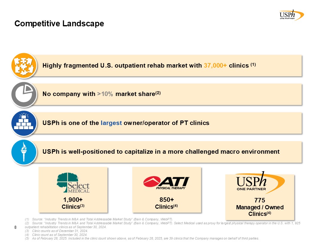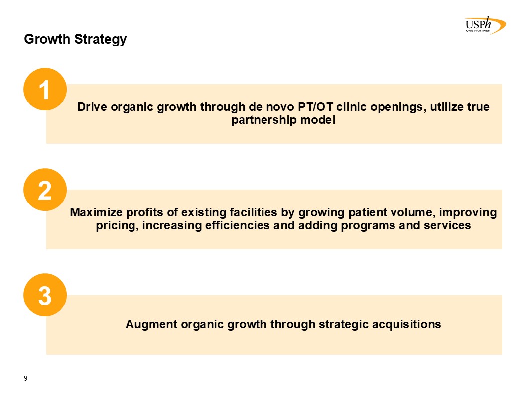 Competitive Landscape  8  Source: “Industry Trends in M&A and Total Addressable Market Study” (Bain & Company, WebPT).  Source: “Industry Trends in M&A and Total Addressable Market Study” (Bain & Company, WebPT). Select Medical used as proxy for largest physical therapy operator in the U.S. with 1, 925 outpatient rehabilitation clinics as of September 30, 2024.   Clinic counts as of December 31, 2024.  Clinic count as of September 30, 2024.   As of February 28, 2025. Included in the clinic count shown above, as of February 28, 2025, are 39 clinics that the Company manages on behalf of third parties.   1,900+  Clinics(3)  850+  Clinics(4)  775  Managed / Owned Clinics(4)  Highly fragmented U.S. outpatient rehab market with 37,000+ clinics (1)   USPh is one of the largest owner/operator of PT clinics  No company with >10% market share(2)  USPh is well-positioned to capitalize in a more challenged macro environment