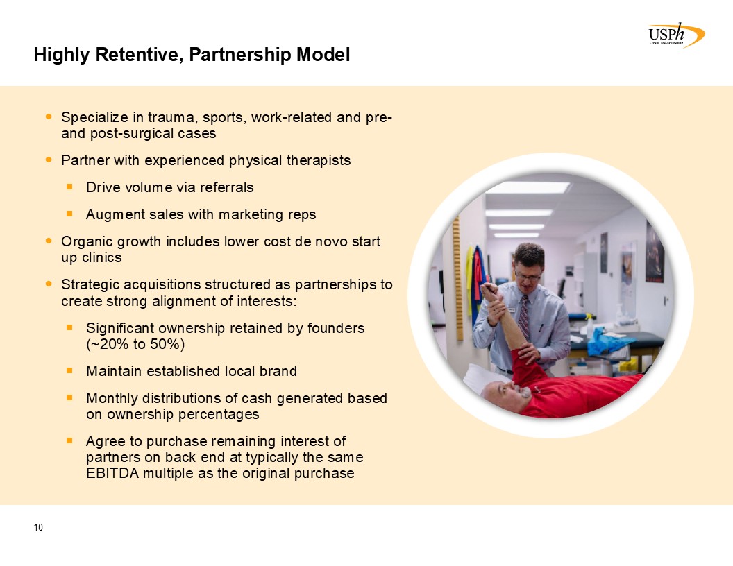 Growth Strategy  9  Drive organic growth through de novo PT/OT clinic openings, utilize true partnership model  Maximize profits of existing facilities by growing patient volume, improving pricing, increasing efficiencies and adding programs and services  Augment organic growth through strategic acquisitions  1  2  3