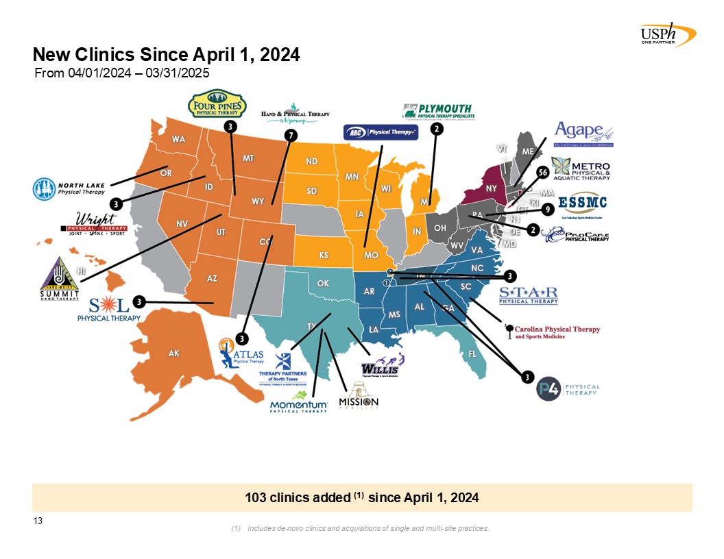 Acquisition Strategy  12  Completed more than 50 acquisitions since 2005 ranging in size from 1 to 52 clinics  Acquisitions include more than five industrial injury prevention services businesses  Seeking & evaluating M&A transactions is part of USPh’s DNA  Acquisition criteria:  Owner therapists continue to operate clinics and retain significant equity interest  Immediately accretive to earnings  Further de novo growth opportunities  High quality clinics with a history of profitability  Values Alignment