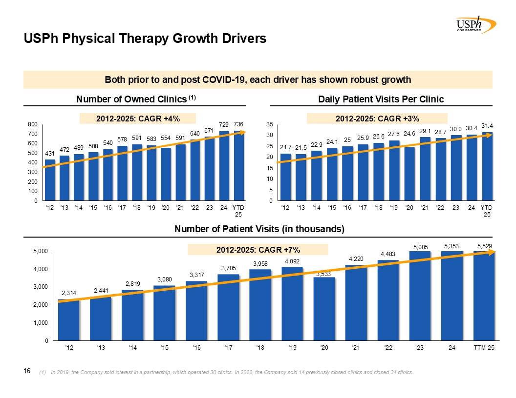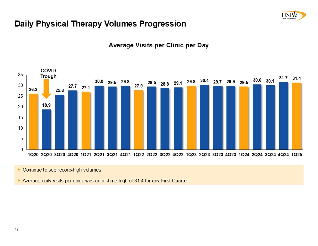 USPh Physical Therapy Growth Drivers  16  In 2019, the Company sold interest in a partnership, which operated 30 clinics. In 2020, the Company sold 14 previously closed clinics and closed 34 clinics.   Number of Owned Clinics (1)  Daily Patient Visits Per Clinic   Number of Patient Visits (in thousands)  Both prior to and post COVID-19, each driver has shown robust growth  2012-2025: CAGR +4%  2012-2025: CAGR +3%  2012-2025: CAGR +7%  5,005  5,353