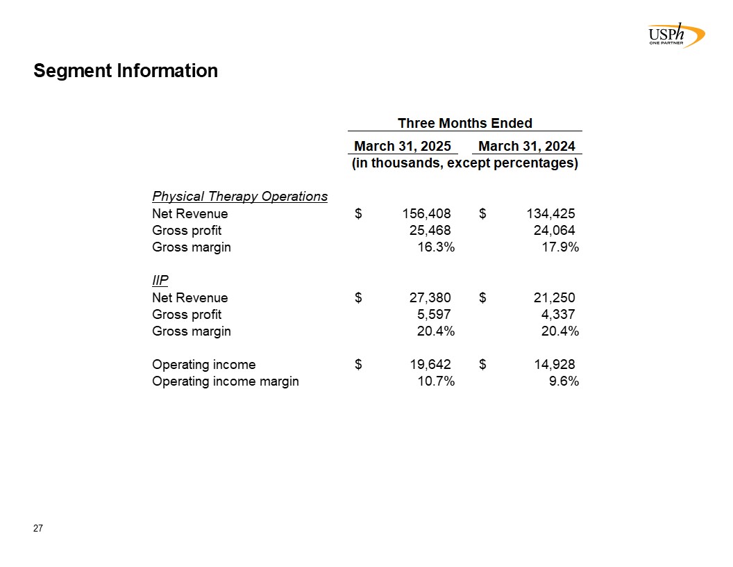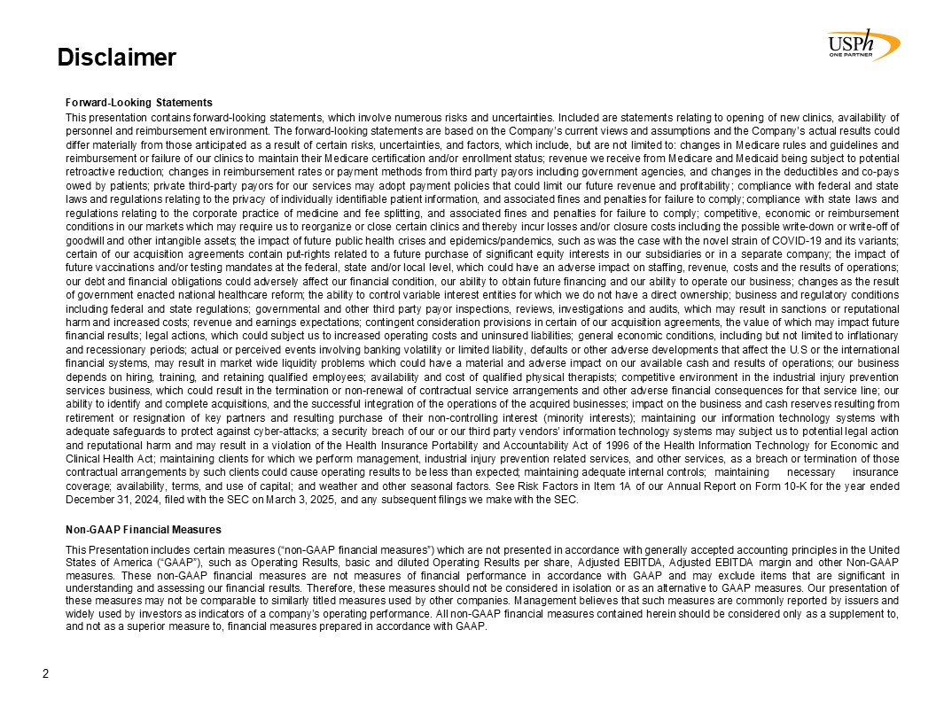 Disclaimer  2  Forward-Looking Statements   This presentation contains forward-looking statements, which involve numerous risks and uncertainties. Included are statements relating to opening of new clinics, availability of personnel and reimbursement environment. The forward-looking statements are based on the Company’s current views and assumptions and the Company’s actual results could differ materially from those anticipated as a result of certain risks, uncertainties, and factors, which include, but are not limited to: changes in Medicare rules and guidelines and reimbursement or failure of our clinics to maintain their Medicare certification and/or enrollment status; revenue we receive from Medicare and Medicaid being subject to potential retroactive reduction; changes in reimbursement rates or payment methods from third party payors including government agencies, and changes in the deductibles and co-pays owed by patients; private third-party payors for our services may adopt payment policies that could limit our future revenue and profitability; compliance with federal and state laws and regulations relating to the privacy of individually identifiable patient information, and associated fines and penalties for failure to comply; compliance with state laws and regulations relating to the corporate practice of medicine and fee splitting, and associated fines and penalties for failure to comply; competitive, economic or reimbursement conditions in our markets which may require us to reorganize or close certain clinics and thereby incur losses and/or closure costs including the possible write-down or write-off of goodwill and other intangible assets; the impact of future public health crises and epidemics/pandemics, such as was the case with the novel strain of COVID-19 and its variants; certain of our acquisition agreements contain put-rights related to a future purchase of significant equity interests in our subsidiaries or in a separate company; the impact of future vaccinations and/or testing mandates at the federal, state and/or local level, which could have an adverse impact on staffing, revenue, costs and the results of operations; our debt and financial obligations could adversely affect our financial condition, our ability to obtain future financing and our ability to operate our business; changes as the result of government enacted national healthcare reform; the ability to control variable interest entities for which we do not have a direct ownership; business and regulatory conditions including federal and state regulations; governmental and other third party payor inspections, reviews, investigations and audits, which may result in sanctions or reputational harm and increased costs; revenue and earnings expectations; contingent consideration provisions in certain of our acquisition agreements, the value of which may impact future financial results; legal actions, which could subject us to increased operating costs and uninsured liabilities; general economic conditions, including but not limited to inflationary and recessionary periods; actual or perceived events involving banking volatility or limited liability, defaults or other adverse developments that affect the U.S or the international financial systems, may result in market wide liquidity problems which could have a material and adverse impact on our available cash and results of operations; our business depends on hiring, training, and retaining qualified employees; availability and cost of qualified physical therapists; competitive environment in the industrial injury prevention services business, which could result in the termination or non-renewal of contractual service arrangements and other adverse financial consequences for that service line; our ability to identify and complete acquisitions, and the successful integration of the operations of the acquired businesses; impact on the business and cash reserves resulting from retirement or resignation of key partners and resulting purchase of their non-controlling interest (minority interests); maintaining our information technology systems with adequate safeguards to protect against cyber-attacks; a security breach of our or our third party vendors’ information technology systems may subject us to potential legal action and reputational harm and may result in a violation of the Health Insurance Portability and Accountability Act of 1996 of the Health Information Technology for Economic and Clinical Health Act; maintaining clients for which we perform management, industrial injury prevention related services, and other services, as a breach or termination of those contractual arrangements by such clients could cause operating results to be less than expected; maintaining adequate internal controls; maintaining necessary insurance coverage; availability, terms, and use of capital; and weather and other seasonal factors. See Risk Factors in Item 1A of our Annual Report on Form 10-K for the year ended December 31, 2024, filed with the SEC on March 3, 2025, and any subsequent filings we make with the SEC.  Non-GAAP Financial Measures  This Presentation includes certain measures (“non-GAAP financial measures”) which are not presented in accordance with generally accepted accounting principles in the United States of America (“GAAP”), such as Operating Results, basic and diluted Operating Results per share, Adjusted EBITDA, Adjusted EBITDA margin and other Non-GAAP measures. These non-GAAP financial measures are not measures of financial performance in accordance with GAAP and may exclude items that are significant in understanding and assessing our financial results. Therefore, these measures should not be considered in isolation or as an alternative to GAAP measures. Our presentation of these measures may not be comparable to similarly titled measures used by other companies. Management believes that such measures are commonly reported by iss