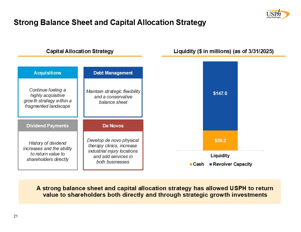 Strong Balance Sheet and Capital Allocation Strategy  21  At June 30, 2024, we had $112.9 million in cash and $142.5 million outstanding on our term loan. We have $175 million available for borrowings under our revolving facility.  A strong balance sheet and capital allocation strategy has allowed USPH to return value to shareholders both directly and through strategic growth investments  In 2023, the Company generated Adjusted EBITDA(1) of $77.7 million  Liquidity ($ in millions) (as of 06/30/24)  Acquisitions  Continue fueling a highly acquisitive growth strategy within a fragmented landscape  Maintain strategic flexibility and a conservative balance sheet   Debt Management  Capital Allocation Strategy  History of dividend increases and the ability to return value to shareholders directly   Dividend Issuances  Debt Management  Minimize interest expense and maintain strategic flexibility  Liquidity ($ in millions) (as of 3/31/2025)  Dividend Payments  History of dividend increases and the ability to return value to shareholders directly   De Novos  Develop de novo physical therapy clinics, increase industrial injury locations and add services in   both businesses