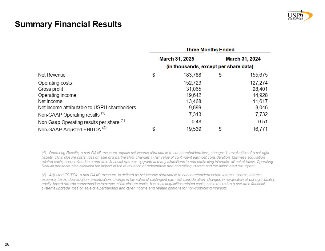 Transaction Overview  Demonstrated Track Record of Consistent Growth  Over the last decade, USPH has consistently grown, organically and through strategic acquisitions  USPH Revenue ($ in millions)  Adj. EBITDA(1) ($ in millions)  4.7%  15.5%  8.6%  7.6%  16.1%  9.6%  6.2%  (12.2%)  17.0%  11.7%  19.2%  21.3%  18.4%  16.8%  25  Growth (%)  Margin (%)  2013-2024: CAGR +8%  2013-2024: CAGR +9%  Adjusted EBITDA and Adjusted EBITDA margin are non-GAAP financial measures and have not been prepared in accordance with GAAP. See Reconciliation of Non-GAAP Financial Measures - Adjusted EBITDA and Adjusted EBITDA margin for further detail.  9.4%  15.9%  11.0%  15.2%  Adjusted EBITDA Margin  Q1 2025 – 13.7% vs. 13.2% in Q1 2024