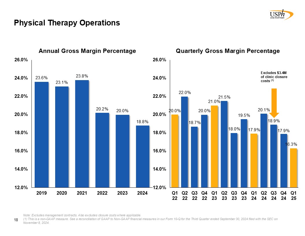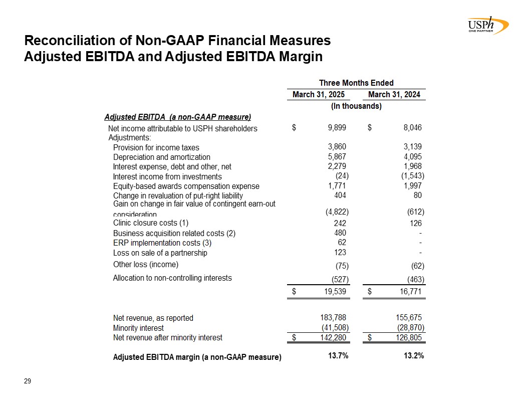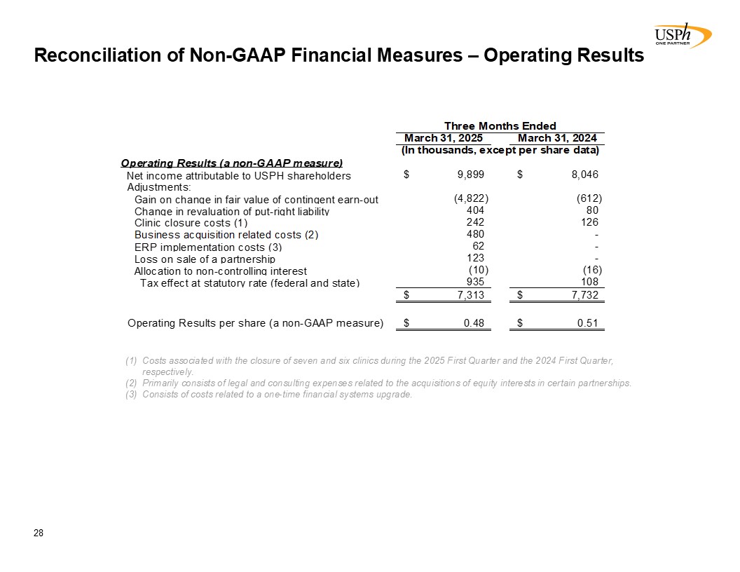 Reconciliation of Non-GAAP Financial Measures – Operating Results  28  Costs associated with the closure of seven and six clinics during the 2025 First Quarter and the 2024 First Quarter, respectively.  Primarily consists of legal and consulting expenses related to the acquisitions of equity interests in certain partnerships.   Consists of costs related to a one-time financial systems upgrade.