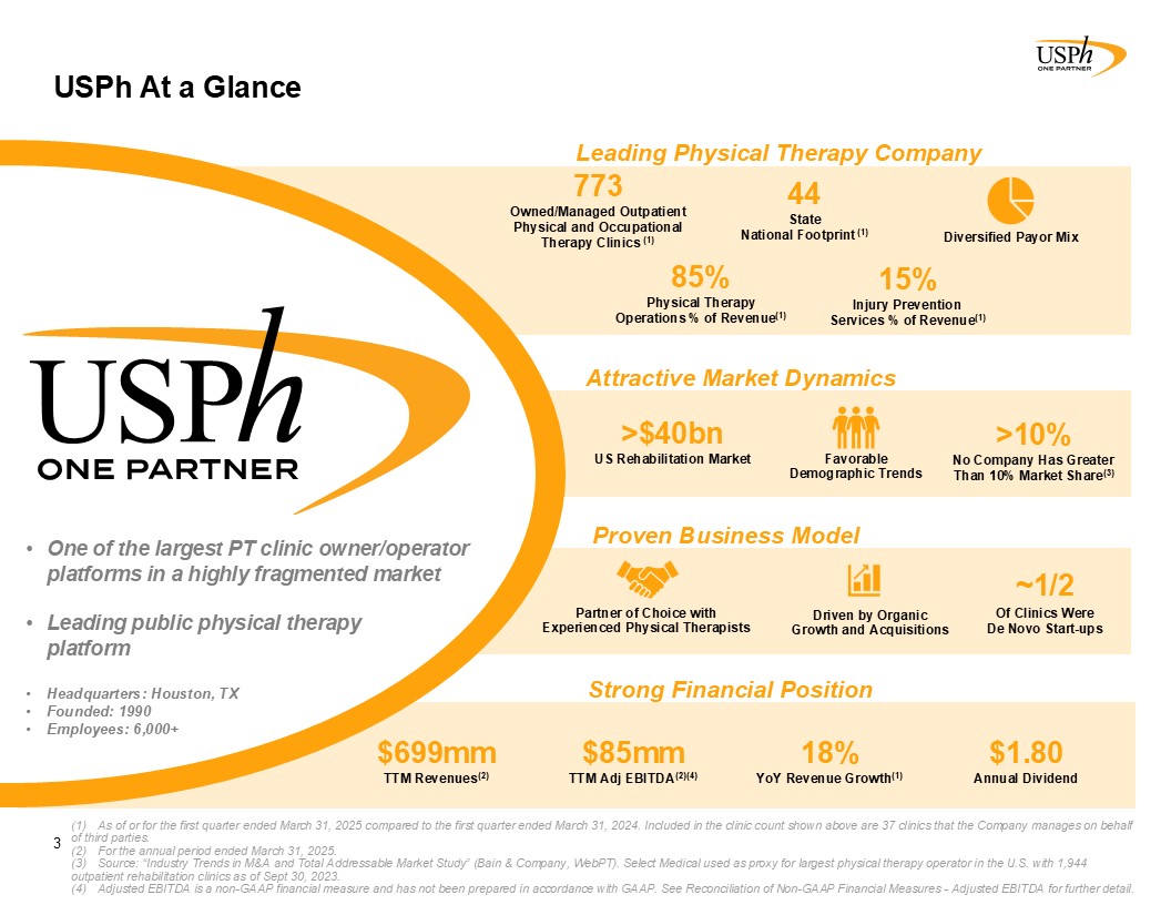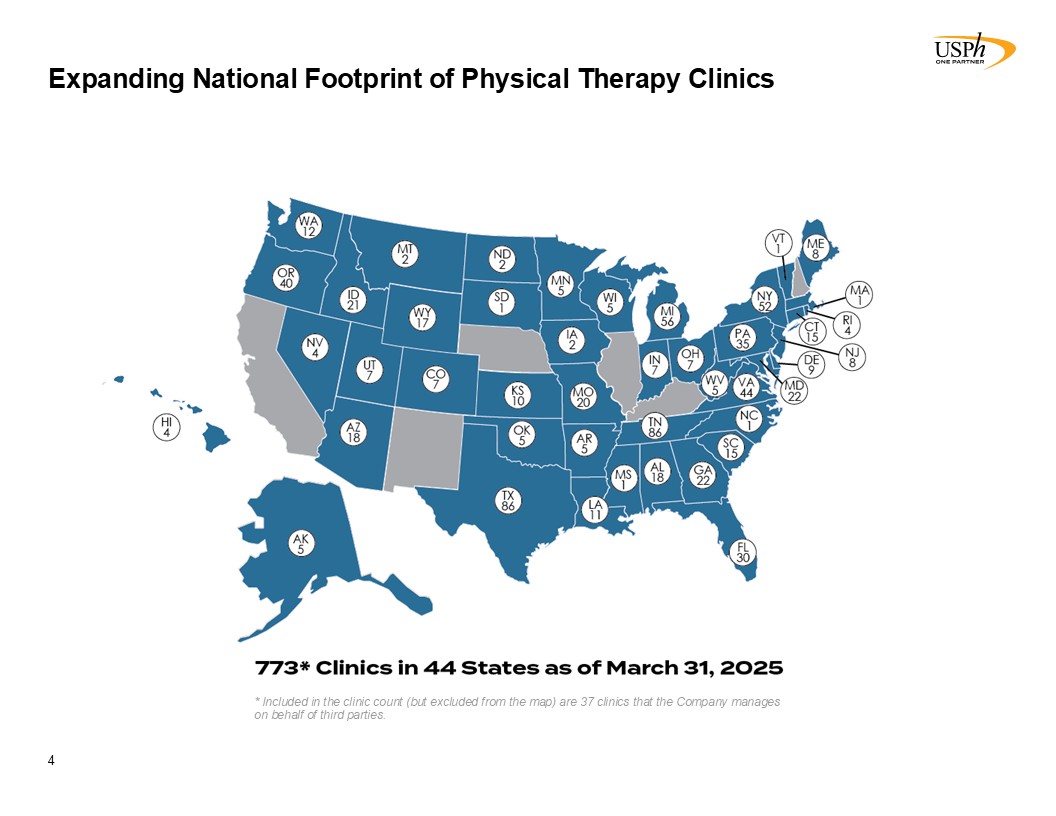 773  Owned/Managed Outpatient Physical and Occupational Therapy Clinics (1)  44  State   National Footprint (1)  85%  Physical Therapy   Operations % of Revenue(1)  15%  Injury Prevention   Services % of Revenue(1)  >$40bn  US Rehabilitation Market  >10%  No Company Has Greater Than 10% Market Share(3)  Partner of Choice with Experienced Physical Therapists  ~1/2  Of Clinics Were   De Novo Start-ups  $699mm  TTM Revenues(2)  $85mm  TTM Adj EBITDA(2)(4)  18%  YoY Revenue Growth(1)  $1.80  Annual Dividend  Proven Business Model  Attractive Market Dynamics  Leading Physical Therapy Company  USPh At a Glance  3  Strong Financial Position  One of the largest PT clinic owner/operator platforms in a highly fragmented market   Leading public physical therapy platform  Headquarters: Houston, TX  Founded: 1990  Employees: 6,000+  Favorable Demographic Trends  As of or for the first quarter ended March 31, 2025 compared to the first quarter ended March 31, 2024. Included in the clinic count shown above are 37 clinics that the Company manages on behalf of third parties.   For the annual period ended March 31, 2025.  Source: “Industry Trends in M&A and Total Addressable Market Study” (Bain & Company, WebPT). Select Medical used as proxy for largest physical therapy operator in the U.S. with 1,944 outpatient rehabilitation clinics as of Sept 30, 2023.   Adjusted EBITDA is a non-GAAP financial measure and has not been prepared in accordance with GAAP. See Reconciliation of Non-GAAP Financial Measures - Adjusted EBITDA for further detail.  Driven by Organic Growth and Acquisitions  Diversified Payor Mix