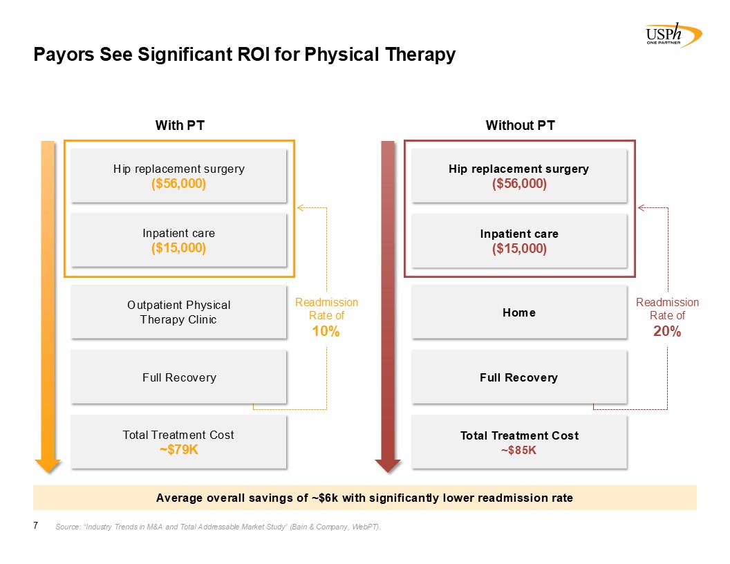 Outpatient Clinics are the Leading Setting For Care  6  Orthopedic rehab is the primary driver of physical therapy services, representing approximately 60% of visits  Source: “Industry Trends in M&A and Total Addressable Market Study” (Bain & Company, WebPT).  Outpatient Clinics  Hospitals; State, Local, and Private   Home Health   Offices of Physicians  Other  Physical Therapy Delivery Mix
