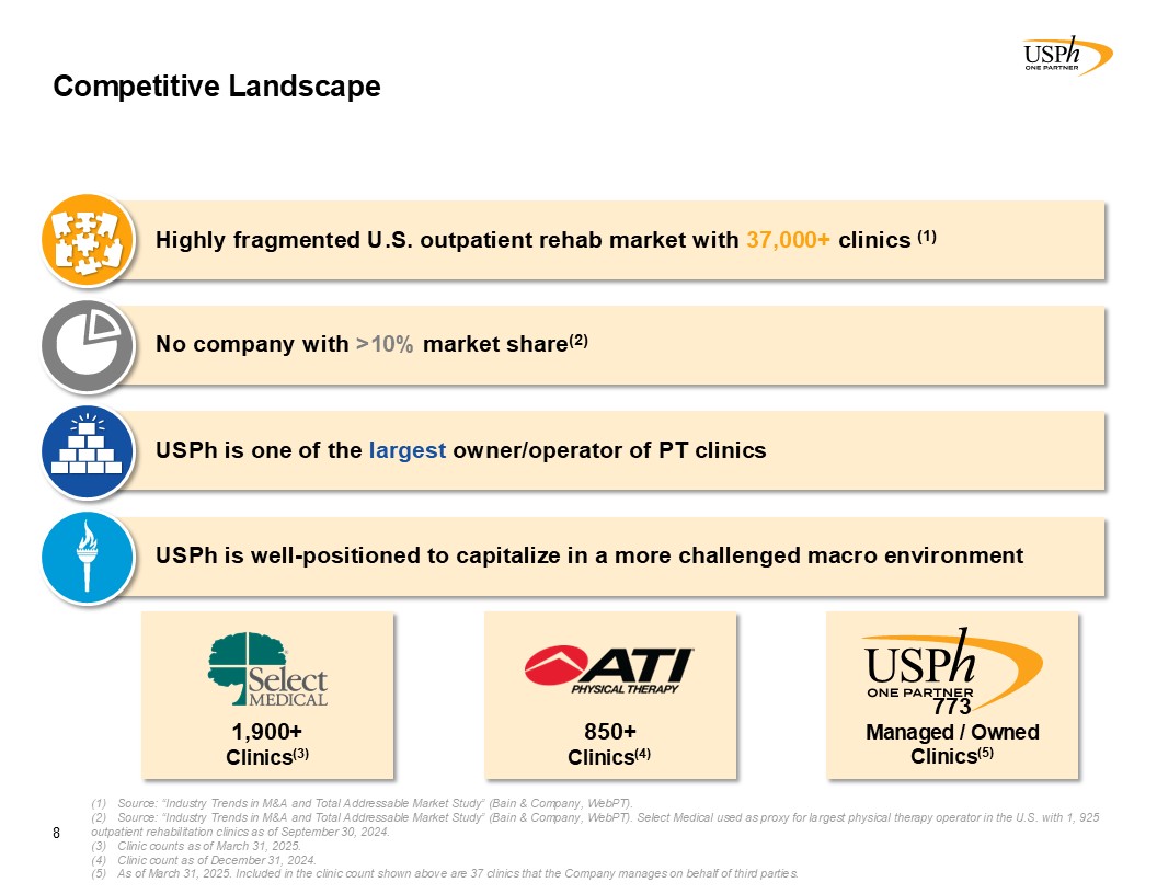 Competitive Landscape  8  Source: “Industry Trends in M&A and Total Addressable Market Study” (Bain & Company, WebPT).  Source: “Industry Trends in M&A and Total Addressable Market Study” (Bain & Company, WebPT). Select Medical used as proxy for largest physical therapy operator in the U.S. with 1, 925 outpatient rehabilitation clinics as of September 30, 2024.   Clinic counts as of March 31, 2025.  Clinic count as of December 31, 2024.  As of March 31, 2025. Included in the clinic count shown above are 37 clinics that the Company manages on behalf of third parties.   1,900+  Clinics(3)  850+  Clinics(4)  773  Managed / Owned Clinics(5)  Highly fragmented U.S. outpatient rehab market with 37,000+ clinics (1)   USPh is one of the largest owner/operator of PT clinics  No company with >10% market share(2)  USPh is well-positioned to capitalize in a more challenged macro environment