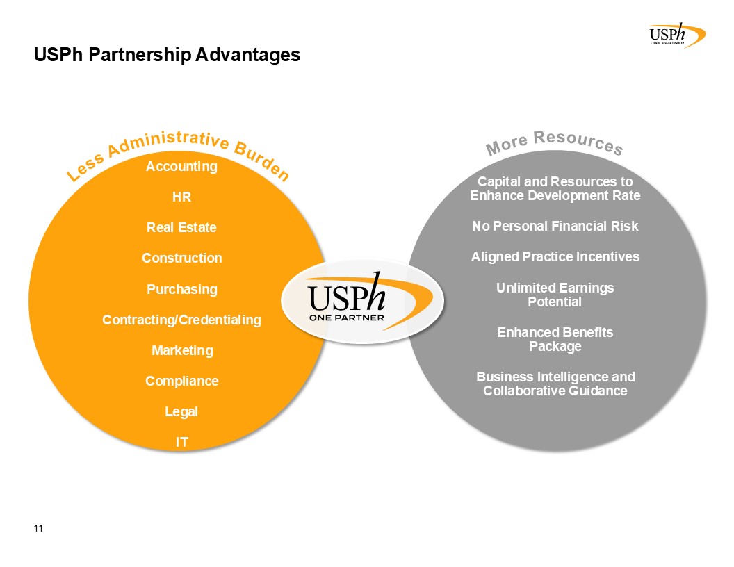 More Resources  Less Administrative Burden  USPh Partnership Advantages  11  Accounting  HR  Real Estate  Construction  Purchasing  Contracting/Credentialing  Marketing  Compliance  Legal  IT  Capital and Resources to Enhance Development Rate  No Personal Financial Risk  Aligned Practice Incentives  Unlimited Earnings Potential   Enhanced Benefits Package  Business Intelligence and Collaborative Guidance