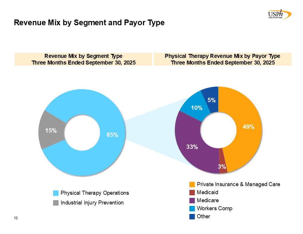 Revenue Mix by Segment and Payor Type  15  Physical Therapy Revenue Mix by Payor Type   Three Months Ended September 30, 2025  Other  Workers Comp  Private Insurance & Managed Care  Medicaid  Medicare  Revenue Mix by Segment Type  Three Months Ended September 30, 2025  Physical Therapy Operations  Industrial Injury Prevention