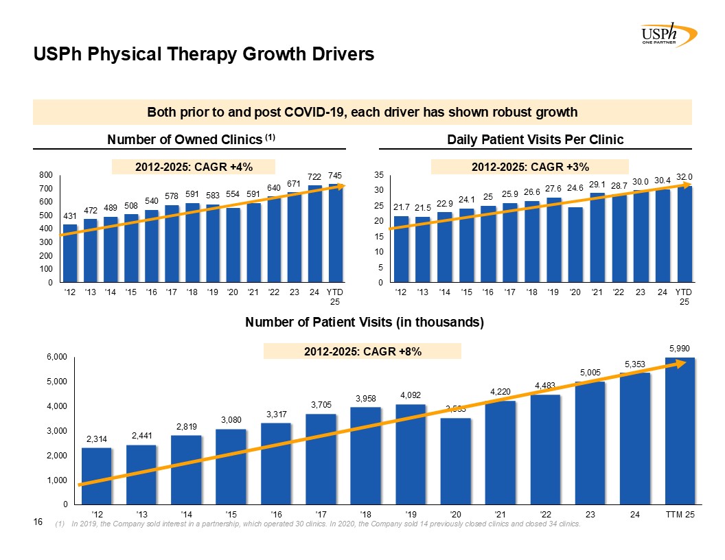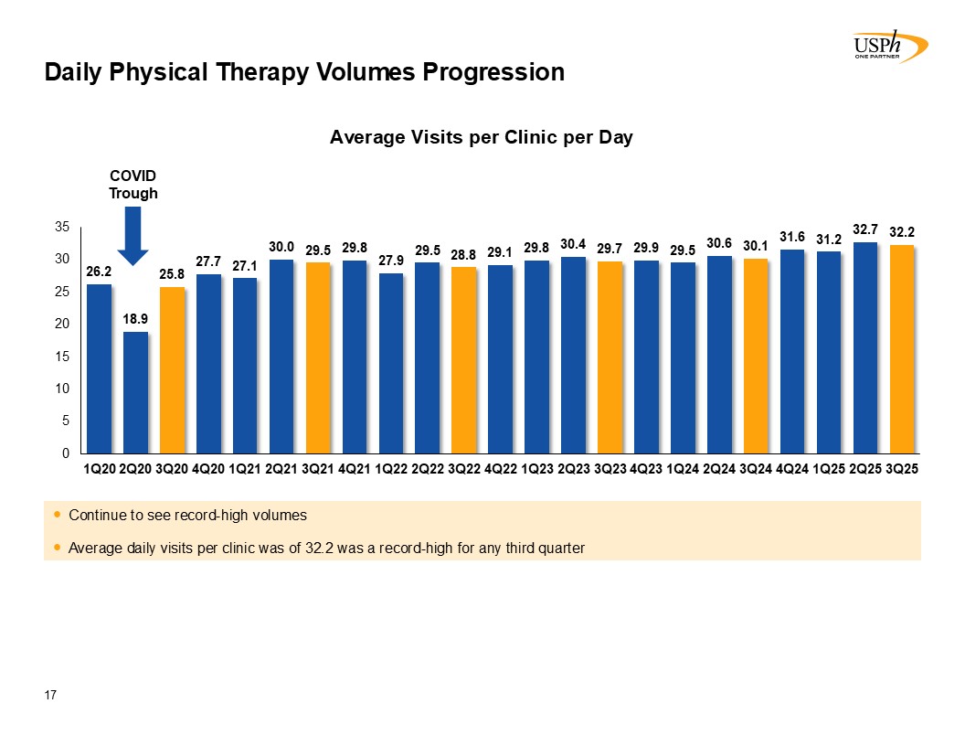 USPh Physical Therapy Growth Drivers  16  In 2019, the Company sold interest in a partnership, which operated 30 clinics. In 2020, the Company sold 14 previously closed clinics and closed 34 clinics.   Number of Owned Clinics (1)  Daily Patient Visits Per Clinic   Number of Patient Visits (in thousands)  Both prior to and post COVID-19, each driver has shown robust growth  2012-2025: CAGR +4%  2012-2025: CAGR +3%  2012-2025: CAGR +8%