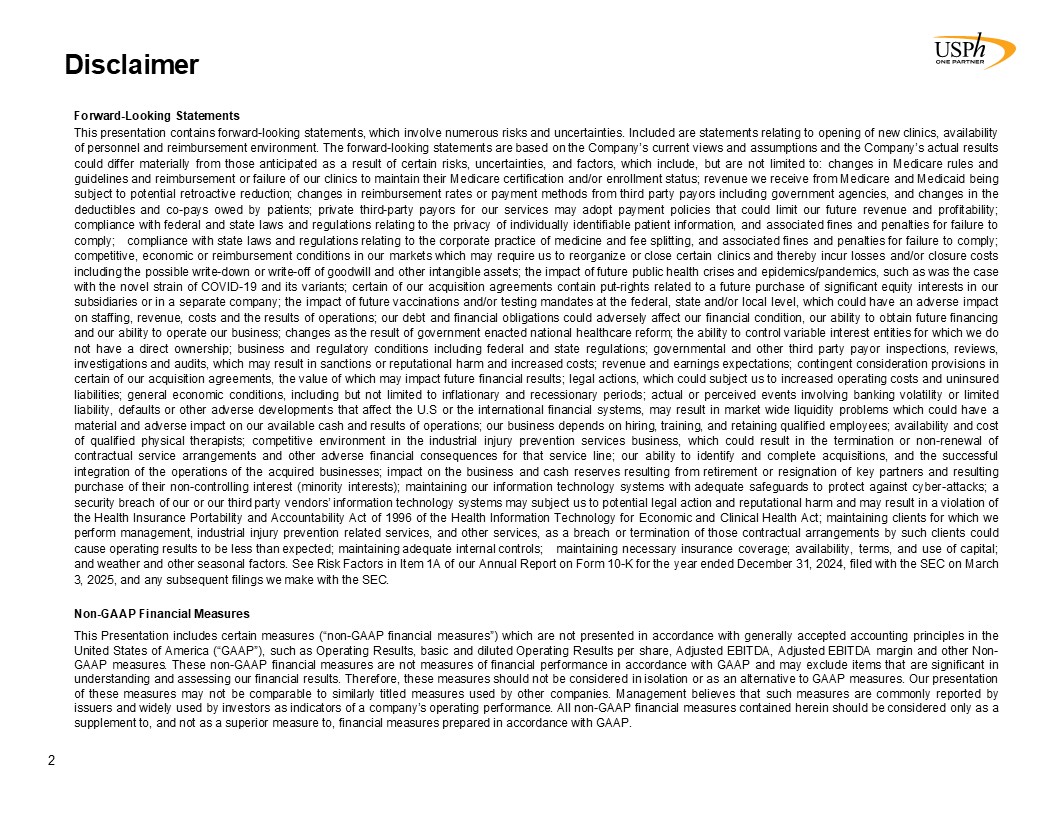 Disclaimer  2  Forward-Looking Statements   This presentation contains forward-looking statements, which involve numerous risks and uncertainties. Included are statements relating to opening of new clinics, availability of personnel and reimbursement environment. The forward-looking statements are based on the Company’s current views and assumptions and the Company’s actual results could differ materially from those anticipated as a result of certain risks, uncertainties, and factors, which include, but are not limited to: changes in Medicare rules and guidelines and reimbursement or failure of our clinics to maintain their Medicare certification and/or enrollment status; revenue we receive from Medicare and Medicaid being subject to potential retroactive reduction; changes in reimbursement rates or payment methods from third party payors including government agencies, and changes in the deductibles and co-pays owed by patients; private third-party payors for our services may adopt payment policies that could limit our future revenue and profitability; compliance with federal and state laws and regulations relating to the privacy of individually identifiable patient information, and associated fines and penalties for failure to comply; compliance with state laws and regulations relating to the corporate practice of medicine and fee splitting, and associated fines and penalties for failure to comply; competitive, economic or reimbursement conditions in our markets which may require us to reorganize or close certain clinics and thereby incur losses and/or closure costs including the possible write-down or write-off of goodwill and other intangible assets; the impact of future public health crises and epidemics/pandemics, such as was the case with the novel strain of COVID-19 and its variants; certain of our acquisition agreements contain put-rights related to a future purchase of significant equity interests in our subsidiaries or in a separate company; the impact of future vaccinations and/or testing mandates at the federal, state and/or local level, which could have an adverse impact on staffing, revenue, costs and the results of operations; our debt and financial obligations could adversely affect our financial condition, our ability to obtain future financing and our ability to operate our business; changes as the result of government enacted national healthcare reform; the ability to control variable interest entities for which we do not have a direct ownership; business and regulatory conditions including federal and state regulations; governmental and other third party payor inspections, reviews, investigations and audits, which may result in sanctions or reputational harm and increased costs; revenue and earnings expectations; contingent consideration provisions in certain of our acquisition agreements, the value of which may impact future financial results; legal actions, which could subject us to increased operating costs and uninsured liabilities; general economic conditions, including but not limited to inflationary and recessionary periods; actual or perceived events involving banking volatility or limited liability, defaults or other adverse developments that affect the U.S or the international financial systems, may result in market wide liquidity problems which could have a material and adverse impact on our available cash and results of operations; our business depends on hiring, training, and retaining qualified employees; availability and cost of qualified physical therapists; competitive environment in the industrial injury prevention services business, which could result in the termination or non-renewal of contractual service arrangements and other adverse financial consequences for that service line; our ability to identify and complete acquisitions, and the successful integration of the operations of the acquired businesses; impact on the business and cash reserves resulting from retirement or resignation of key partners and resulting purchase of their non-controlling interest (minority interests); maintaining our information technology systems with adequate safeguards to protect against cyber-attacks; a security breach of our or our third party vendors’ information technology systems may subject us to potential legal action and reputational harm and may result in a violation of the Health Insurance Portability and Accountability Act of 1996 of the Health Information Technology for Economic and Clinical Health Act; maintaining clients for which we perform management, industrial injury prevention related services, and other services, as a breach or termination of those contractual arrangements by such clients could cause operating results to be less than expected; maintaining adequate internal controls; maintaining necessary insurance coverage; availability, terms, and use of capital; and weather and other seasonal factors. See Risk Factors in Item 1A of our Annual Report on Form 10-K for the year ended December 31, 2024, filed with the SEC on March 3, 2025, and any subsequent filings we make with the SEC.  Non-GAAP Financial Measures  This Presentation includes certain measures (“non-GAAP financial measures”) which are not presented in accordance with generally accepted accounting principles in the United States of America (“GAAP”), such as Operating Results, basic and diluted Operating Results per share, Adjusted EBITDA, Adjusted EBITDA margin and other Non-GAAP measures. These non-GAAP financial measures are not measures of financial performance in accordance with GAAP and may exclude items that are significant in understanding and assessing our financial results. Therefore, these measures should not be considered in isolation or as an alternative to GAAP measures. Our presentation of these measures may not be comparable to similarly titled measures used by other companies. Management believes that such measures are commonly reported by iss