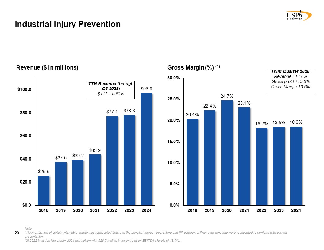 Today  Services performed onsite at >600  client locations  Industrial Injury Prevention  19  Industrial Injury Prevention services include industrial sports medicine and injury prevention, post offer testing, ergonomic services, occupational health and medical services, and specialized solutions  March 2017  2020  14.8%   of Total Revenue(3)  Since USPh’s initial entry into the Industrial Injury Prevention services space, the business has grown both organically and through additional acquisitions  % of Revenue full year 2018.  % of Revenue full year 2020.  Revenue for the year-to-date ended September 30, 2025.   5.6%   of Total Revenue(1)  9.3%   of Total Revenue(2)  Initial Acquisition   into the Industrial Injury Prevention services   space  2018