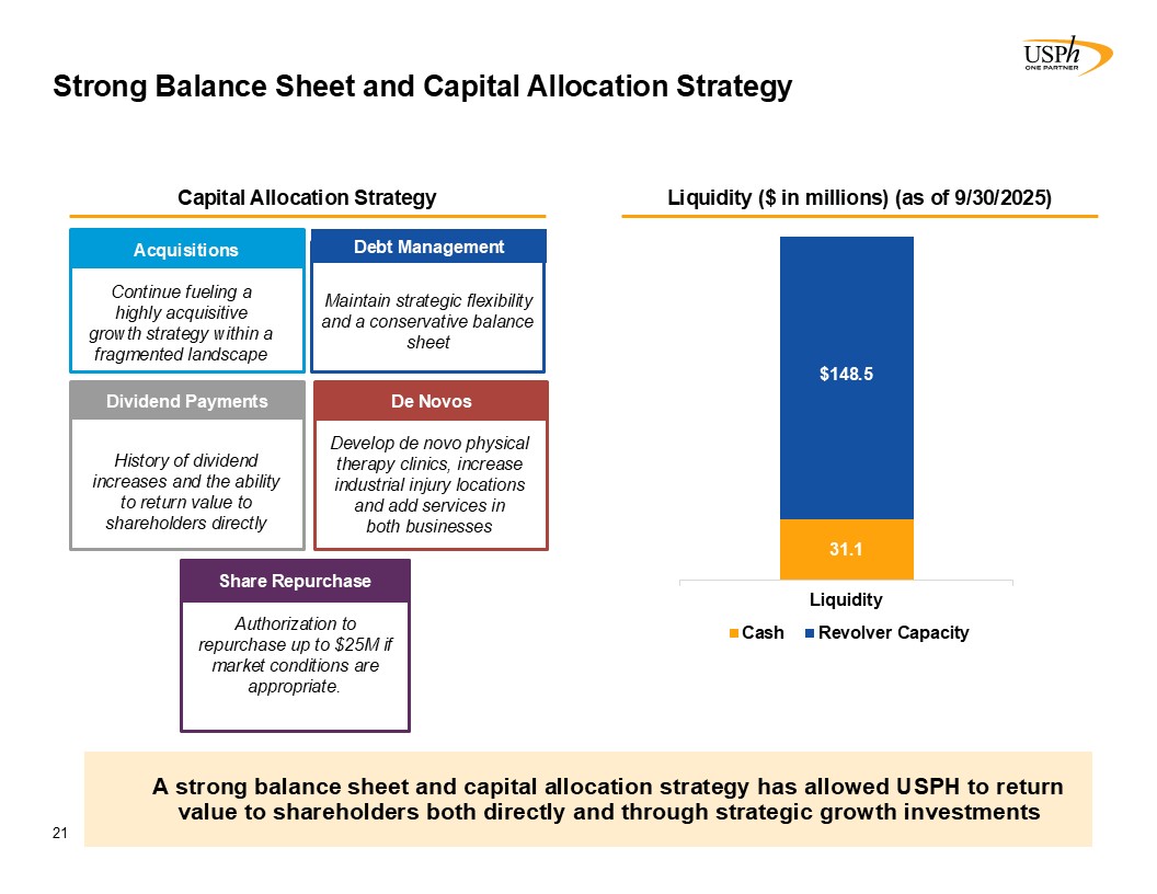 Strong Balance Sheet and Capital Allocation Strategy  21  At June 30, 2024, we had $112.9 million in cash and $142.5 million outstanding on our term loan. We have $175 million available for borrowings under our revolving facility.  A strong balance sheet and capital allocation strategy has allowed USPH to return value to shareholders both directly and through strategic growth investments  In 2023, the Company generated Adjusted EBITDA(1) of $77.7 million  Liquidity ($ in millions) (as of 06/30/24)  Acquisitions  Continue fueling a highly acquisitive growth strategy within a fragmented landscape  Maintain strategic flexibility and a conservative balance sheet   Debt Management  Capital Allocation Strategy  History of dividend increases and the ability to return value to shareholders directly   Dividend Issuances  Debt Management  Minimize interest expense and maintain strategic flexibility  Liquidity ($ in millions) (as of 9/30/2025)  Dividend Payments  History of dividend increases and the ability to return value to shareholders directly   De Novos  Develop de novo physical therapy clinics, increase industrial injury locations and add services in   both businesses  Share Repurchase  Authorization to repurchase up to $25M if market conditions are appropriate.
