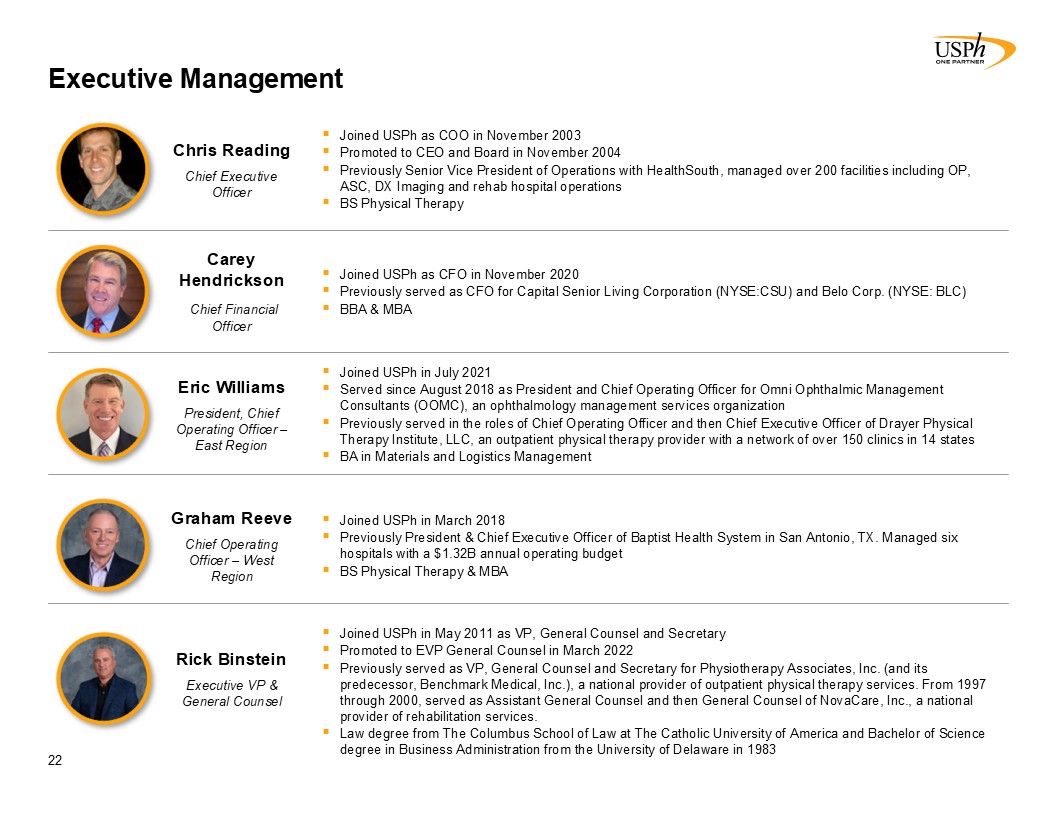 Executive Management  22  https://www.usph.com/about/senior-leadership/  https://www.linkedin.com/in/rick-binstein-66944512  Joined USPh as CFO in November 2020  Previously served as CFO for Capital Senior Living Corporation (NYSE:CSU) and Belo Corp. (NYSE: BLC)  BBA & MBA  Carey Hendrickson   Chief Financial Officer  Joined USPh in March 2018  Previously President & Chief Executive Officer of Baptist Health System in San Antonio, TX. Managed six hospitals with a $1.32B annual operating budget  BS Physical Therapy & MBA  Graham Reeve   Chief Operating Officer – West Region  Joined USPh in July 2021  Served since August 2018 as President and Chief Operating Officer for Omni Ophthalmic Management Consultants (OOMC), an ophthalmology management services organization  Previously served in the roles of Chief Operating Officer and then Chief Executive Officer of Drayer Physical Therapy Institute, LLC, an outpatient physical therapy provider with a network of over 150 clinics in 14 states  BA in Materials and Logistics Management  Eric Williams   President, Chief Operating Officer – East Region  Joined USPh in May 2011 as VP, General Counsel and Secretary  Promoted to EVP General Counsel in March 2022   Previously served as VP, General Counsel and Secretary for Physiotherapy Associates, Inc. (and its predecessor, Benchmark Medical, Inc.), a national provider of outpatient physical therapy services. From 1997 through 2000, served as Assistant General Counsel and then General Counsel of NovaCare, Inc., a national provider of rehabilitation services.   Law degree from The Columbus School of Law at The Catholic University of America and Bachelor of Science degree in Business Administration from the University of Delaware in 1983  Rick Binstein   Executive VP & General Counsel  Joined USPh as COO in November 2003  Promoted to CEO and Board in November 2004  Previously Senior Vice President of Operations with HealthSouth, managed over 200 facilities including OP, ASC, DX Imaging and rehab hospital operations  BS Physical Therapy  Chris Reading  Chief Executive Officer