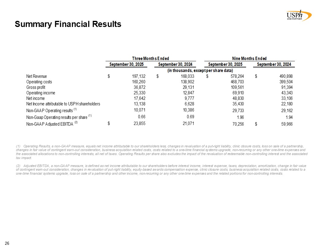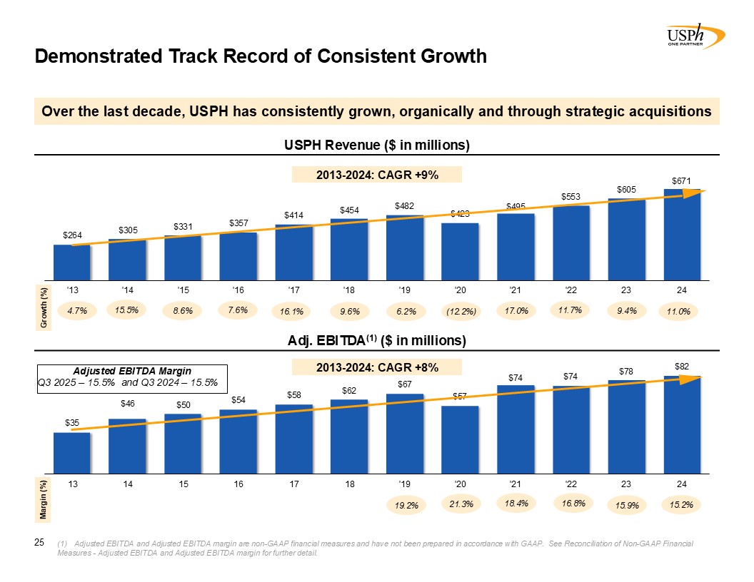 Transaction Overview  Demonstrated Track Record of Consistent Growth  Over the last decade, USPH has consistently grown, organically and through strategic acquisitions  USPH Revenue ($ in millions)  Adj. EBITDA(1) ($ in millions)  4.7%  15.5%  8.6%  7.6%  16.1%  9.6%  6.2%  (12.2%)  17.0%  11.7%  19.2%  21.3%  18.4%  16.8%  25  Growth (%)  Margin (%)  2013-2024: CAGR +8%  2013-2024: CAGR +9%  Adjusted EBITDA and Adjusted EBITDA margin are non-GAAP financial measures and have not been prepared in accordance with GAAP. See Reconciliation of Non-GAAP Financial Measures - Adjusted EBITDA and Adjusted EBITDA margin for further detail.  9.4%  15.9%  11.0%  15.2%  Adjusted EBITDA Margin  Q3 2025 – 15.5% and Q3 2024 – 15.5%