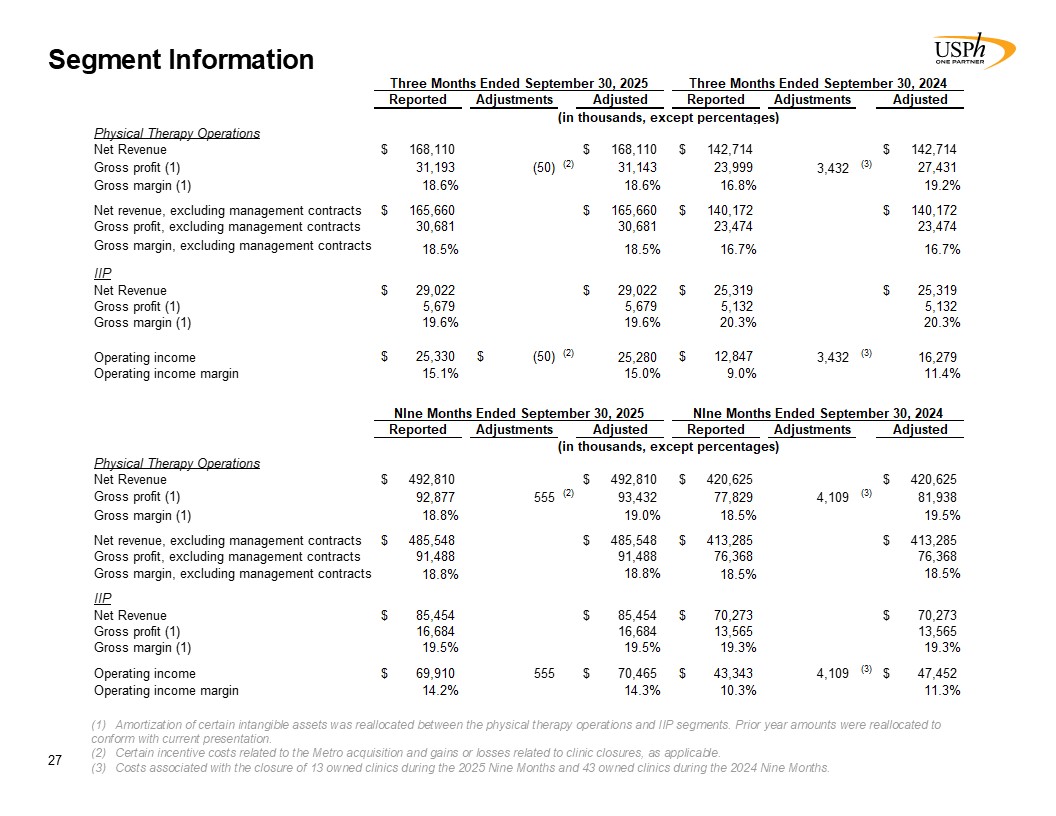 Segment Information  27  Amortization of certain intangible assets was reallocated between the physical therapy operations and IIP segments. Prior year amounts were reallocated to conform with current presentation.   Certain incentive costs related to the Metro acquisition and gains or losses related to clinic closures, as applicable.   Costs associated with the closure of 13 owned clinics during the 2025 Nine Months and 43 owned clinics during the 2024 Nine Months.